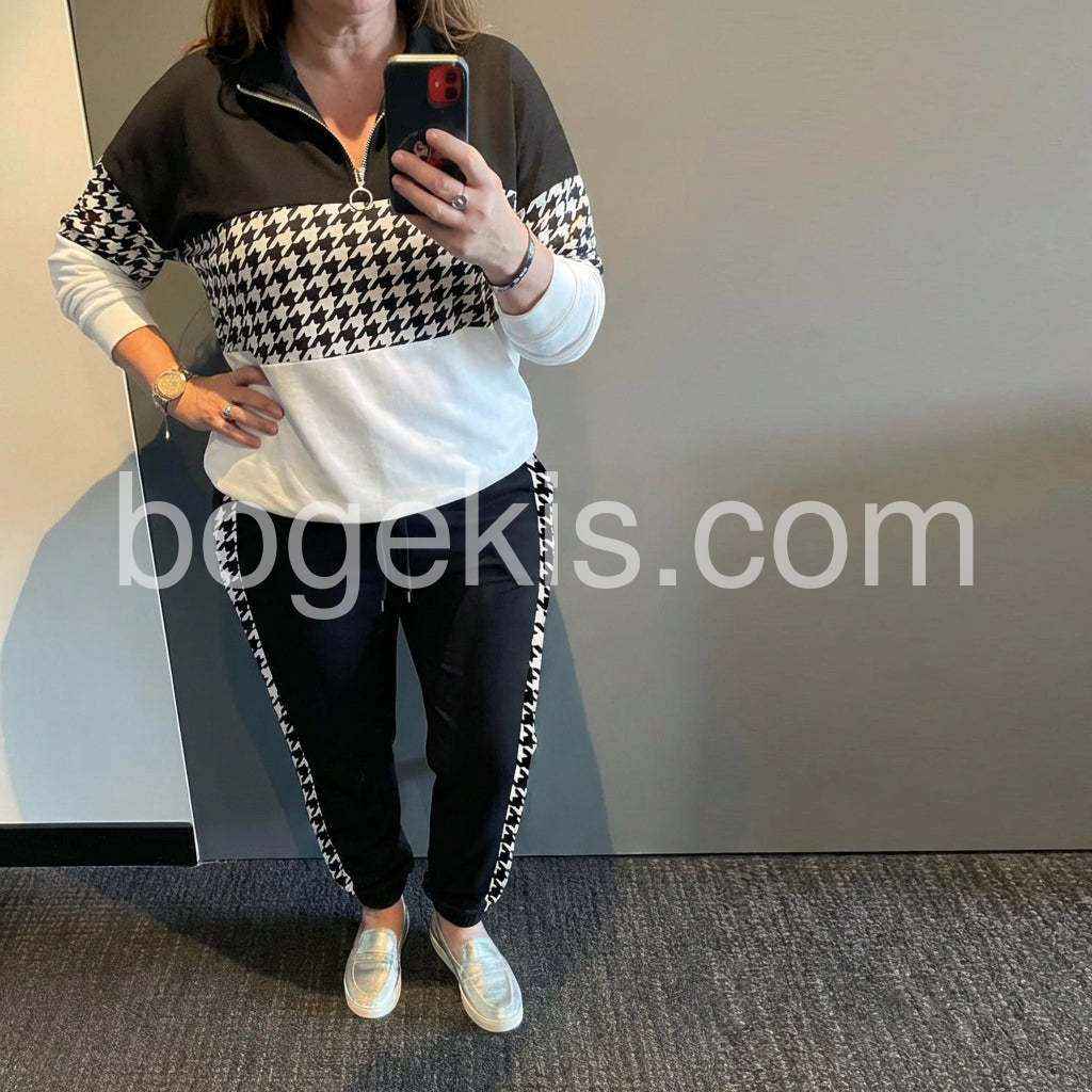 The houndstooth detail on this set is everything! It elevates a standard sweatsuit into something stylish enough to wear out. The top fits perfectly and the quarter zip is very trendy.
