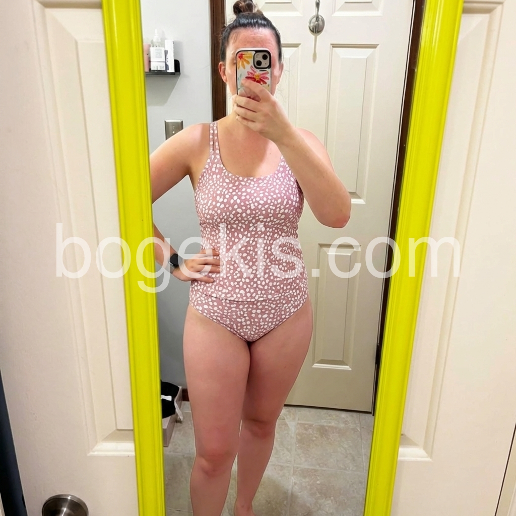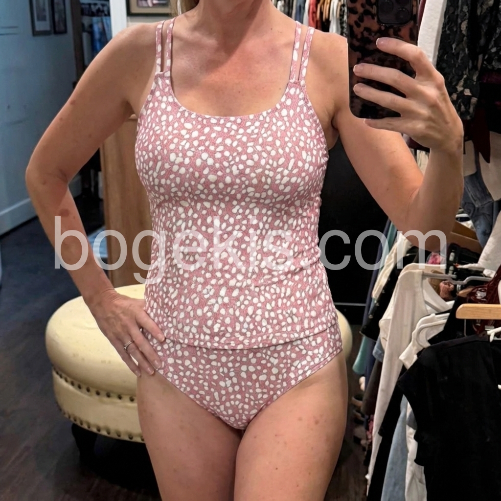 This is the perfect tanking set for active moms who have littles pulling and tugging on them In the pool. Fit is comfy and flattering. The pink print is fantastic. It is vibrant and fun. The print makes me happy. This was way better than I expected so I would definitely recommend. Runs true to size. I am a size small for bathing suits.