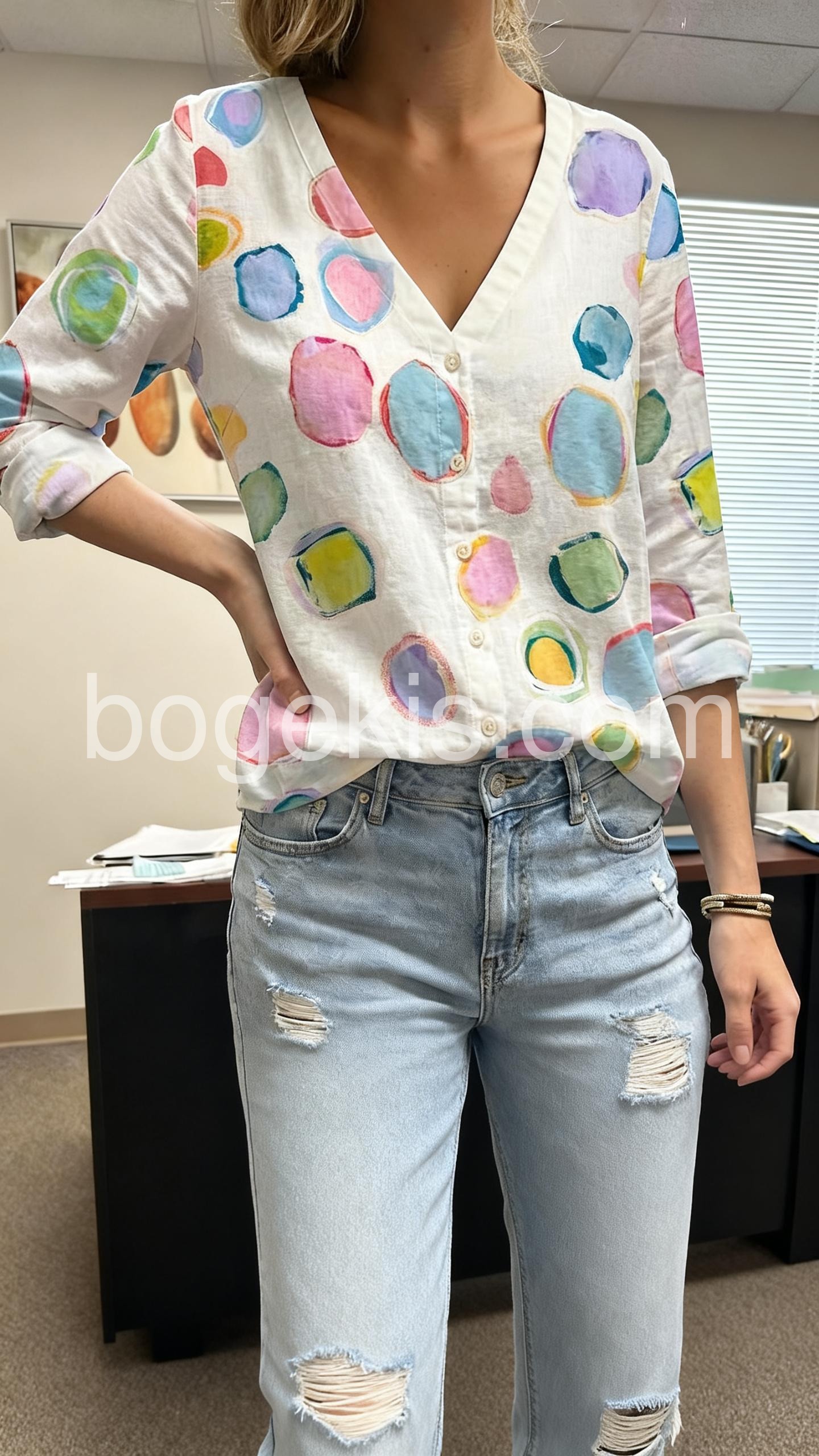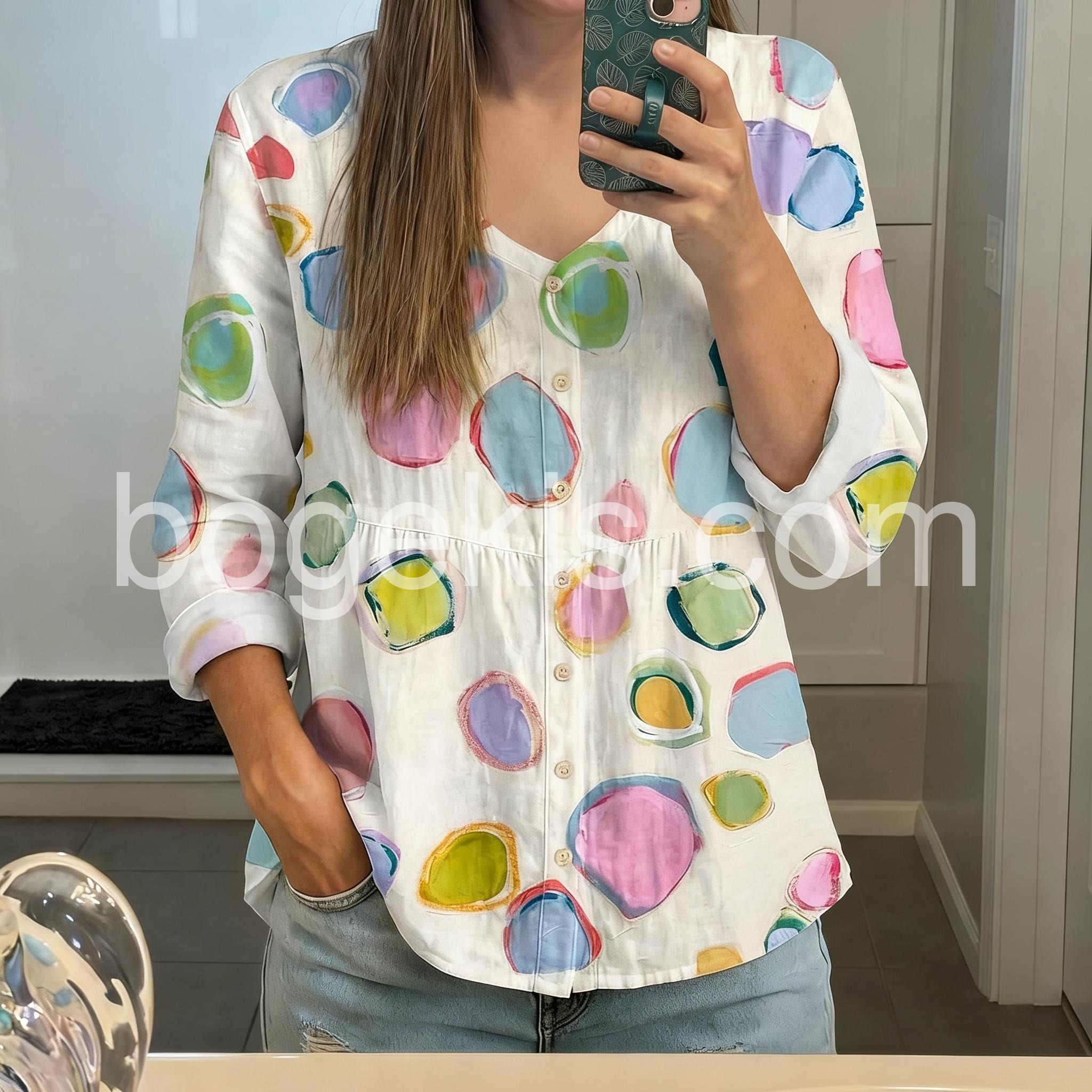 Thisblouse features a vibrant watercolor-style polka dot print on a soft white base. The relaxed fit and button-down front add casual charm. Rolled sleeves and side pockets enhance comfort. Perfect for pairing with jeans or shorts. Ideal for spring and summer days.