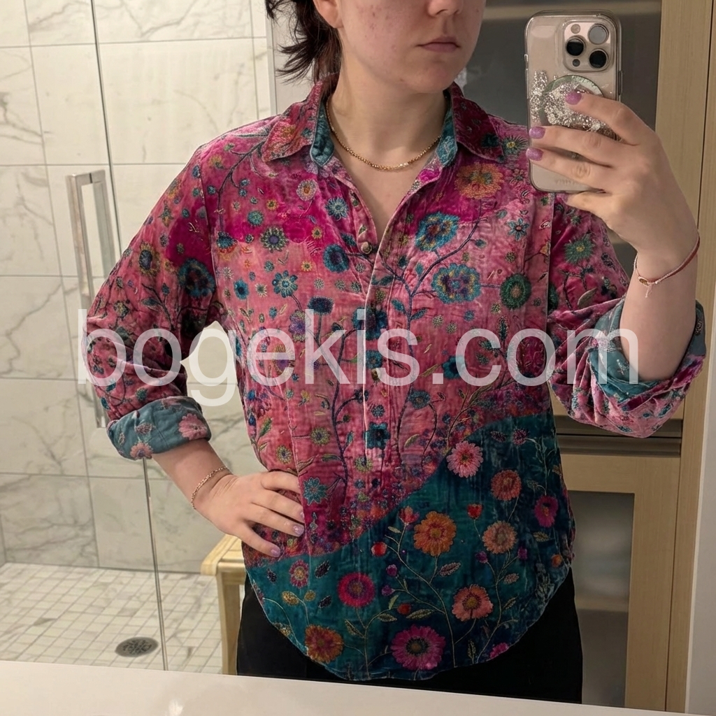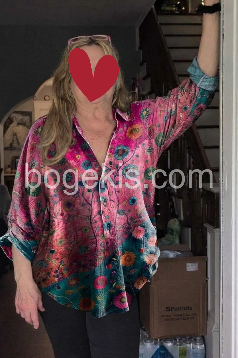 This long-sleeve shirt features a colorful floral print with a bold purple and teal color block design. The relaxed fit and classic collar offer effortless style. Perfect for pairing with jeans or denim shorts. Ideal for bohemian-inspired looks. Lightweight and eye-catching for casual days.