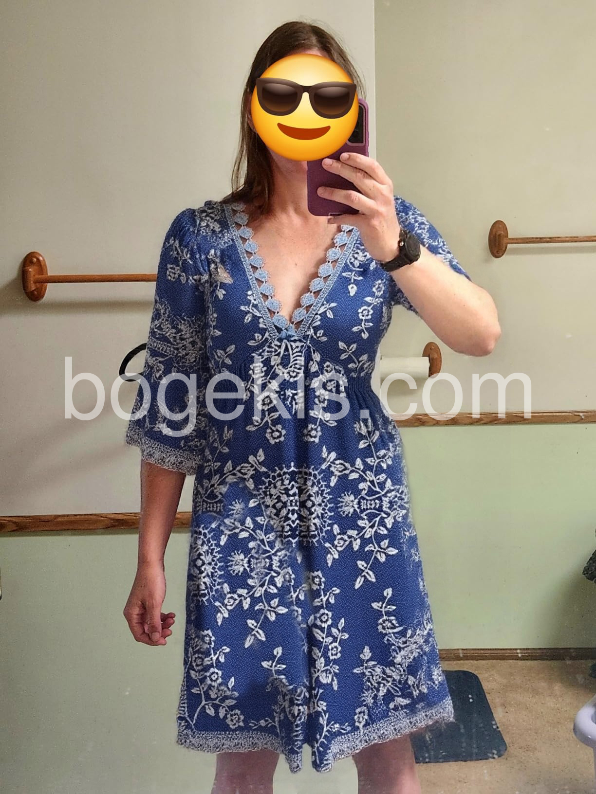 This dress is absolutely stunning! The intricate blue and white pattern is so elegant, and the fit is perfect. It's comfortable enough to wear all day and looks great for both casual outings and more formal events.