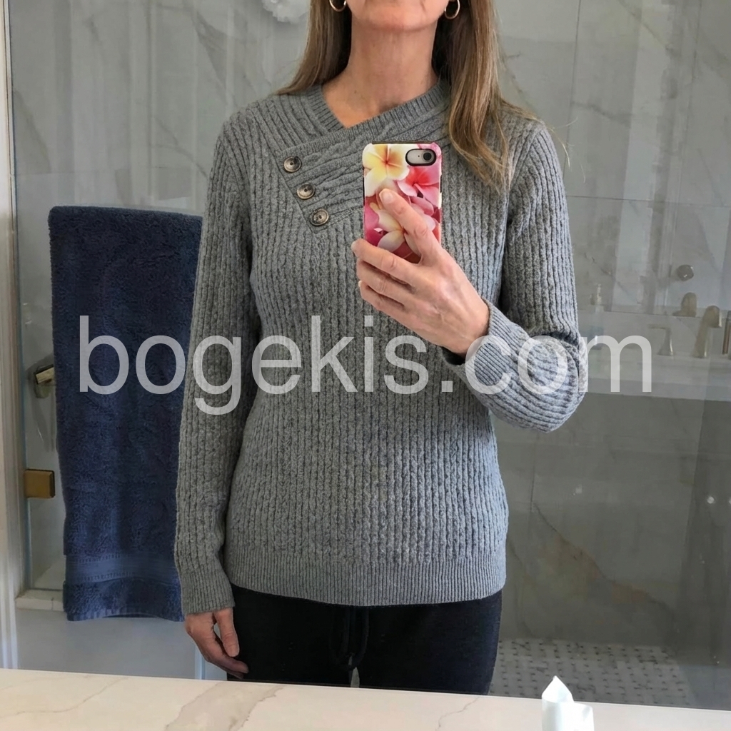 I’m obsessed with this stylish gray sweater! The intricate knit pattern gives it a luxurious look, and the button detail on the neckline is such a cute accent. The fabric is thick enough to keep me warm but not bulky, making it ideal for layering. The fit is relaxed and flattering, draping beautifully over my frame. It’s quickly become my go-to for weekend outings and office casual days—so easy to dress up or down!