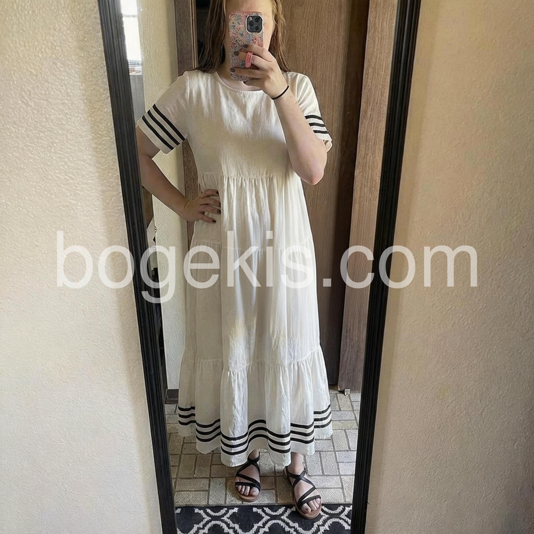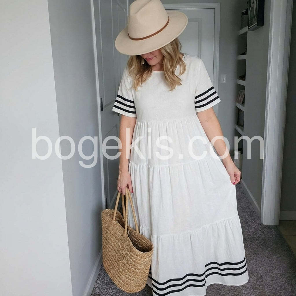 Love the black stripe detailing on the sleeves and hem! It gives a classic nautical vibe. The tiered skirt is so flattering and forgiving. Highly recommend for summer.