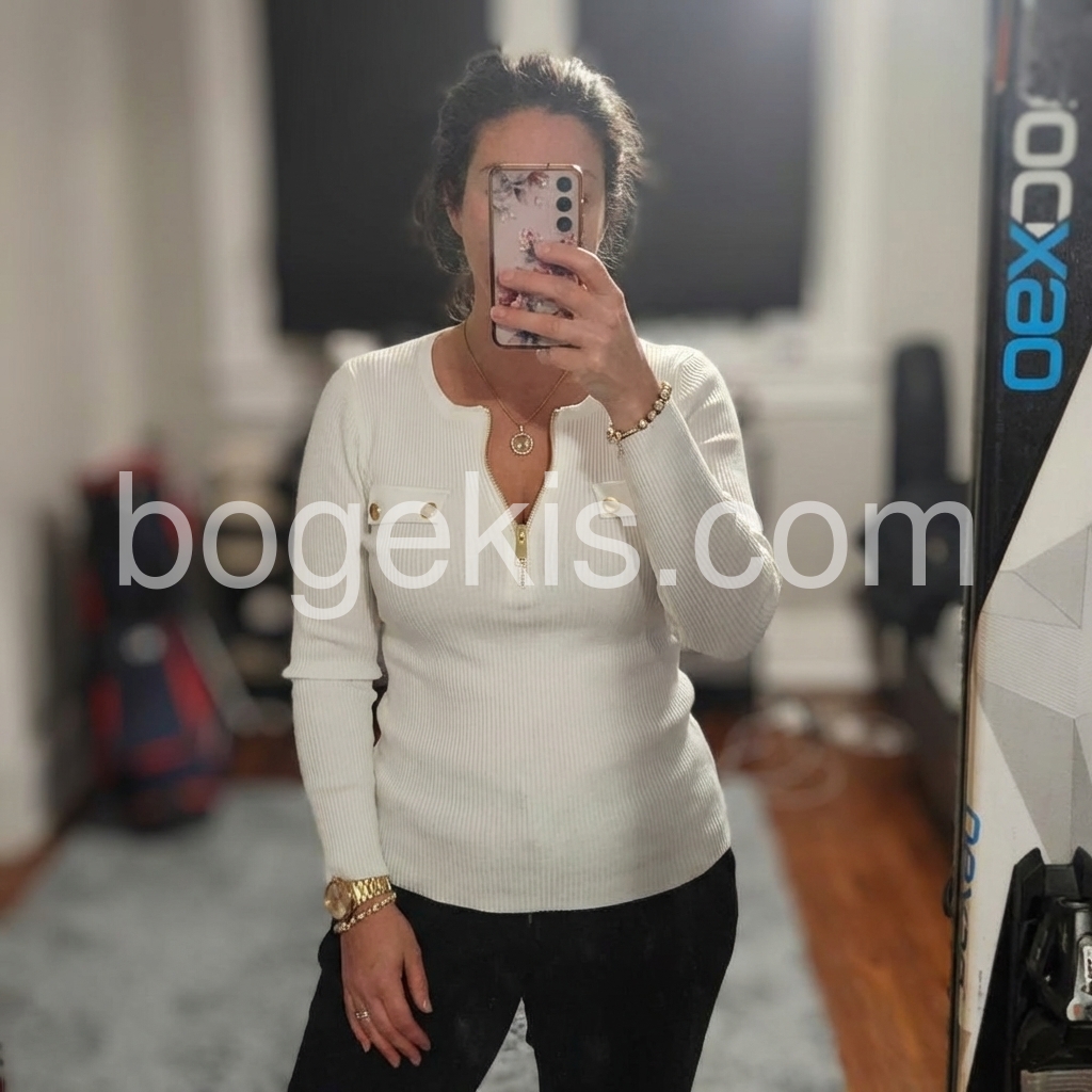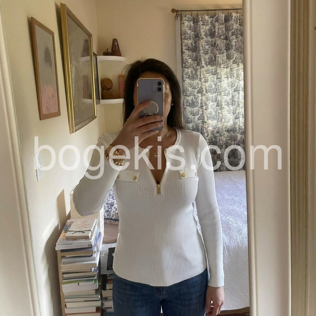 The design is so stylish and feminine. I like the way the zipper sits naturally and how the ribbed knit creates a flattering silhouette. The chest pockets are a fun detail that makes it stand out from typical tops. It’s easy to match and looks great with both casual and slightly dressy outfits.