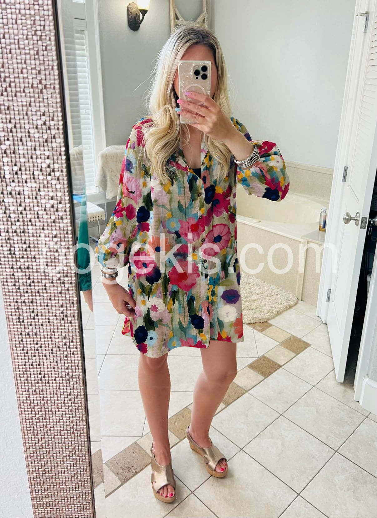 Embrace effortless style with this Bold Floral Print Shirt Mini Dress, a vibrant and versatile piece that turns heads with its lively, painterly design. Crafted from lightweight, breathable fabric—likely cotton or linen blend—this oversized dress features a dynamic watercolor-inspired floral pattern in rich shades of fuchsia, navy blue, coral, white, and soft green, creating a joyful burst of color against a neutral base. The classic shirt silhouette includes a collared neckline, front button closure, and long sleeves that can be rolled up for a relaxed, laid-back look. Its loose, flowing fit drapes beautifully, offering comfort and movement while exuding boho-chic charm. Perfect for casual outings, beach days, or weekend strolls, it pairs effortlessly with sandals, sunglasses, and a crossbody bag. Styled here with layered bracelets and minimalist jewelry, it balances bold print with understated elegance. Let this floral shirt dress become your go-to choice for summer fashion that’s both expressive and easygoing.