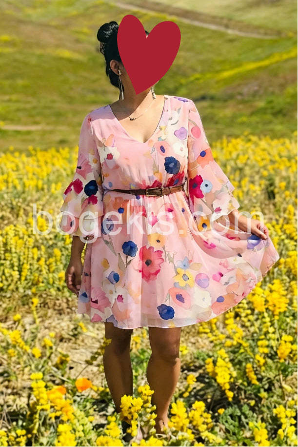 Embrace soft romance and effortless style in this Pink Watercolor Floral 3/4 Sleeve Mini Dress , a dreamy mini dress that captures the beauty of blooming spring. Crafted from lightweight, flowing fabric—likely chiffon or rayon blend—this dress features a delicate watercolor-inspired floral print in vibrant shades of pink, coral, navy, yellow, and white, creating a painterly effect across the soft blush base. The flattering V-neckline adds a touch of elegance, while the short ruffle sleeves bring playful volume and feminine charm. A relaxed, A-line silhouette ensures comfort and ease, making it perfect for casual days, brunches, or warm-weather outings. Paired here with layered bracelets and a pearl necklace, it exudes boho-chic appeal. Ideal for beach trips, garden parties, or weekend strolls, this dress brings a sense of lightness, joy, and timeless femininity to your wardrobe. Let this floral mini dress turn every moment into a gentle celebration of color and style.