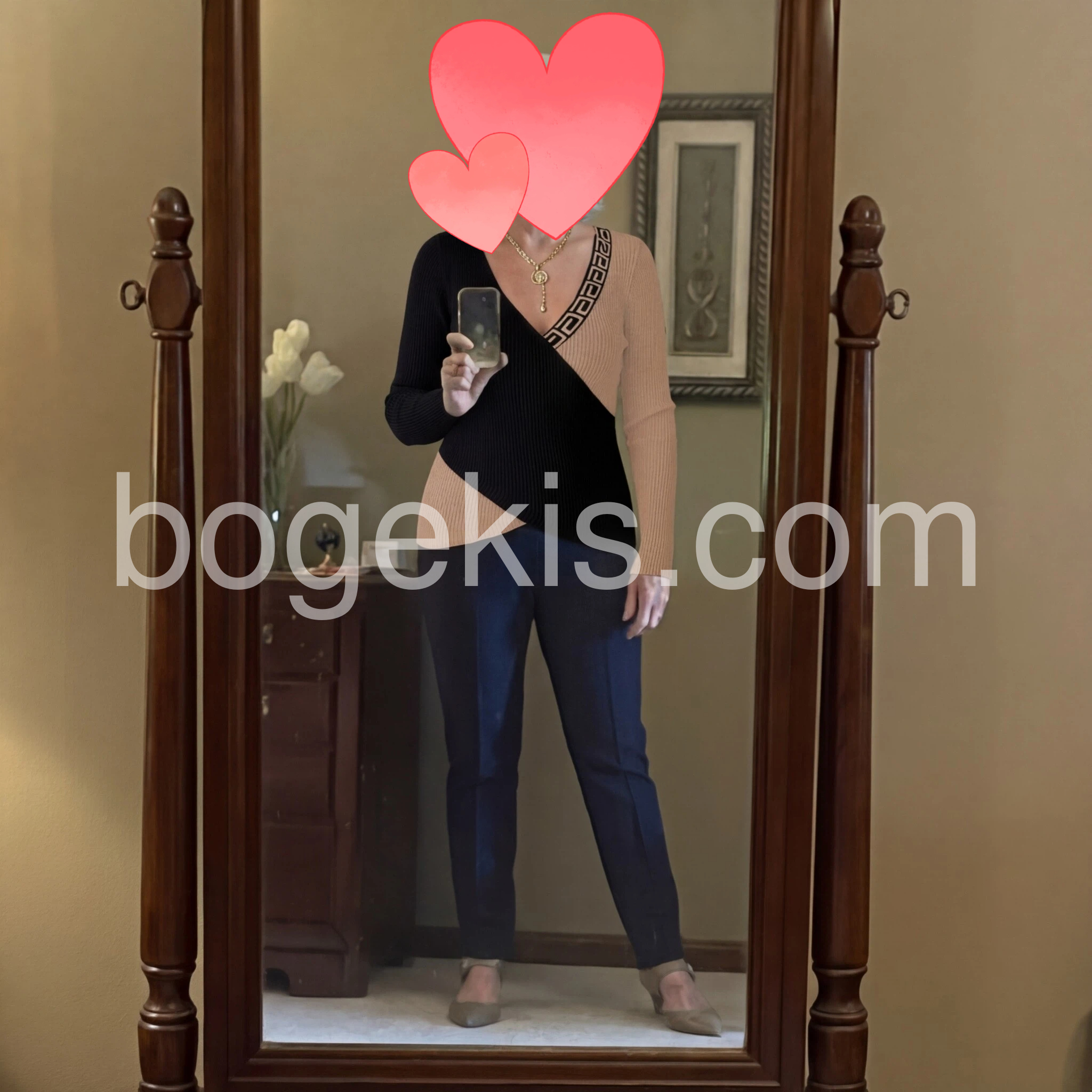 I love this sweater! The black and beige color combination looks classy, and the Greek-key trim on the neckline and strap detail is such a nice touch. It fits comfortably and the knit fabric feels soft and breathable. It also drapes nicely and doesn’t look bulky. I’ve worn it for an outdoor event and it was flattering the whole time—exactly like the photos.