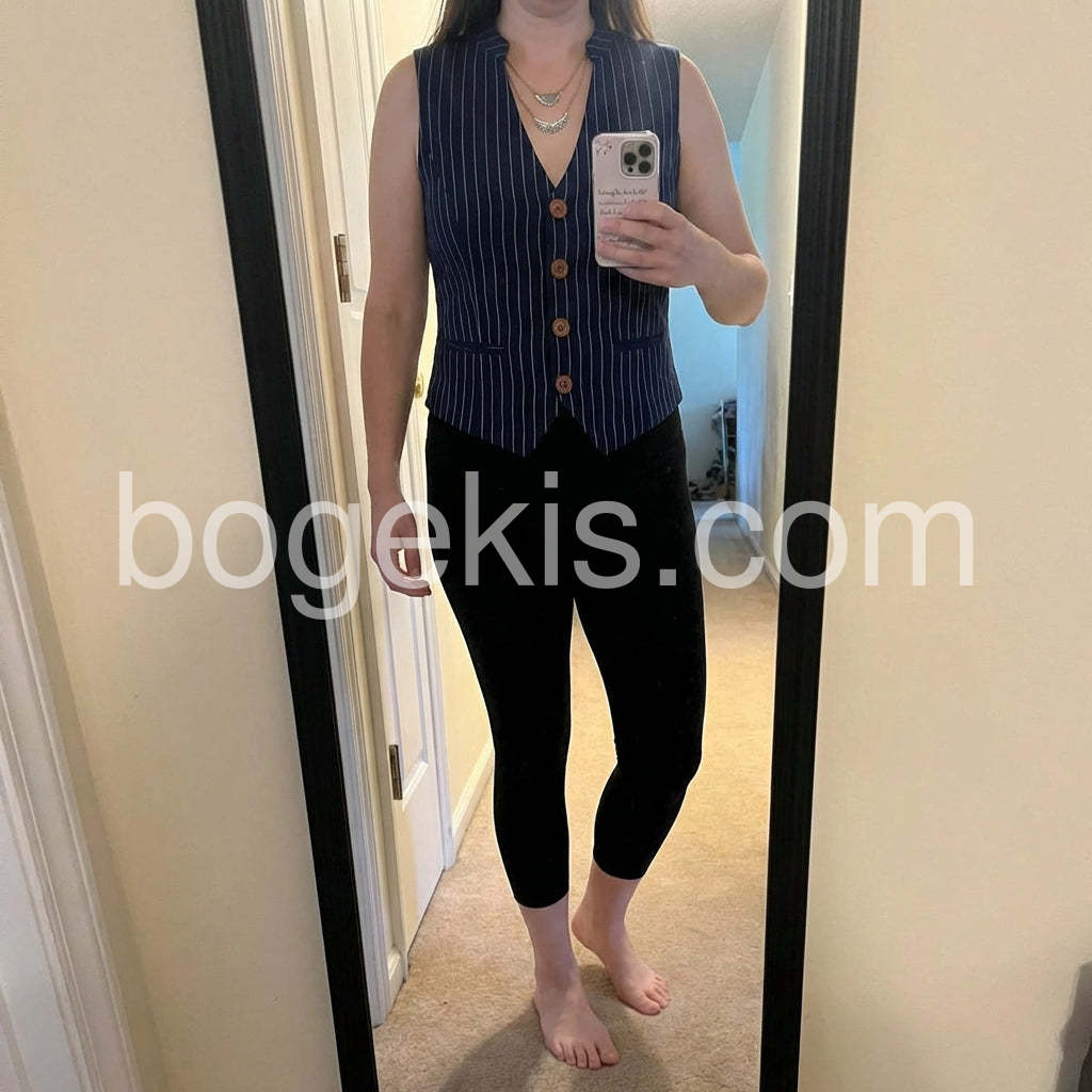 This striped button-down vest is a wardrobe staple now. It is incredibly slimming because of the vertical stripes and the fitted cut. Fits exactly as described on the sizing chart.