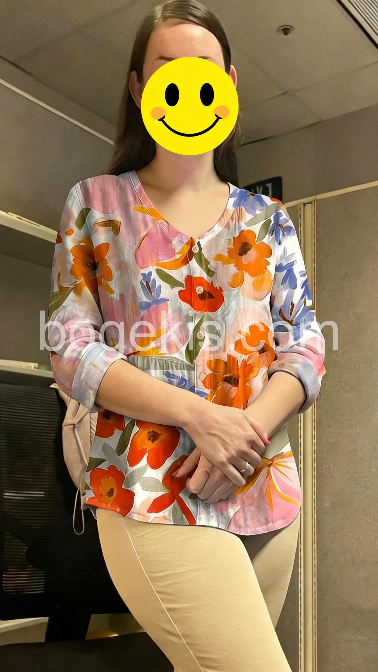 This long-sleeve blouse features a vibrant watercolor floral print in soft pinks, oranges, and blues. The V-neck and button-down front add a classic touch. Lightweight fabric perfect for spring and summer. Pair with jeans or skirts for a fresh, casual look. Effortlessly stylish and comfortable.