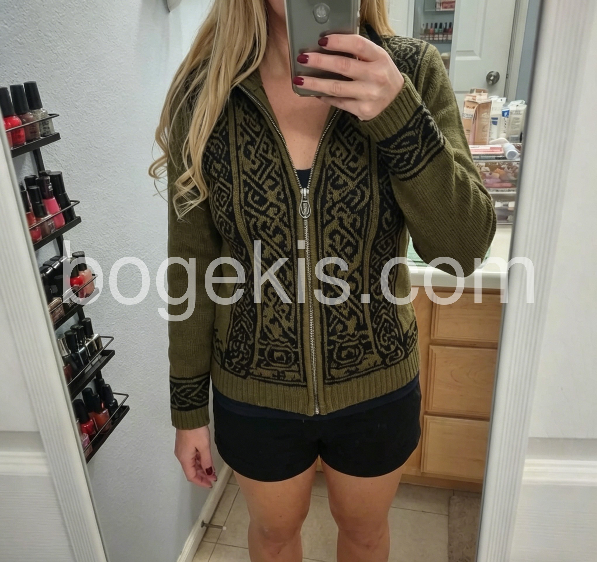 I’m obsessed with this vintage-style knit jacket! The earthy olive hue and ornate Nordic-inspired pattern feel so timeless and unique, way more interesting than basic sweaters. The wool-blend fabric is incredibly soft and insulating, perfect for layering over tees or turtlenecks. The fitted silhouette flatters my figure without being tight, and the silver zipper adds a sleek, polished touch. It’s become my go-to for weekend hikes, coffee runs, and even casual date nights—versatile, stylish, and so cozy!