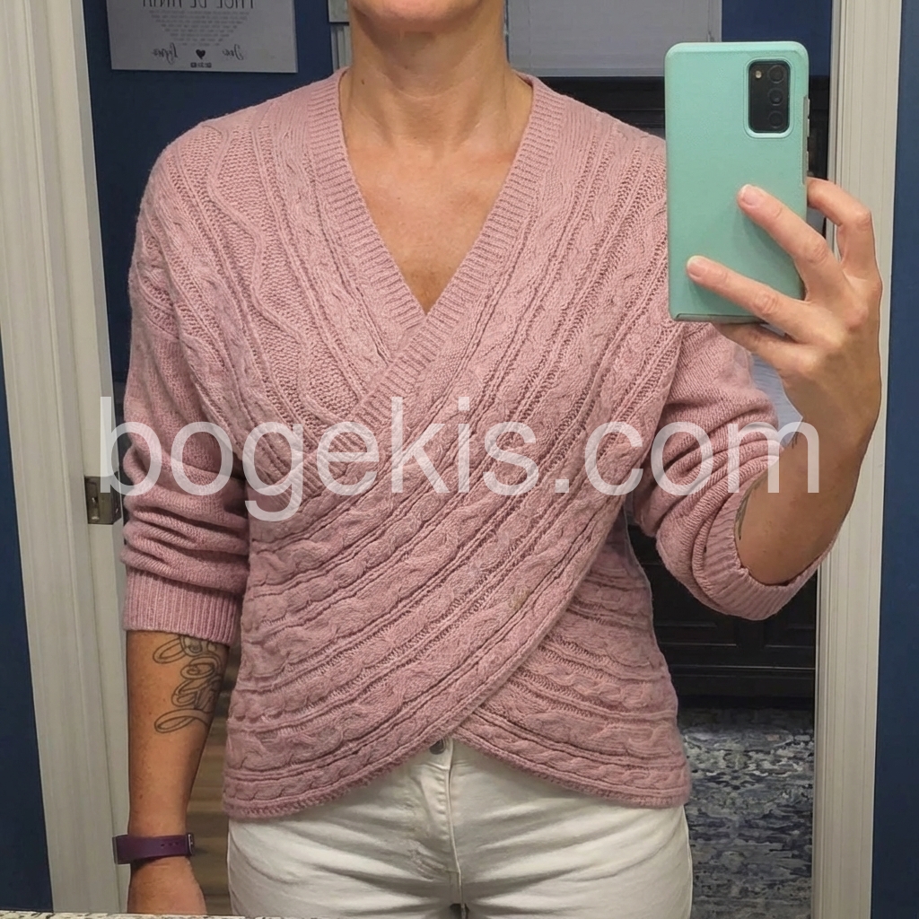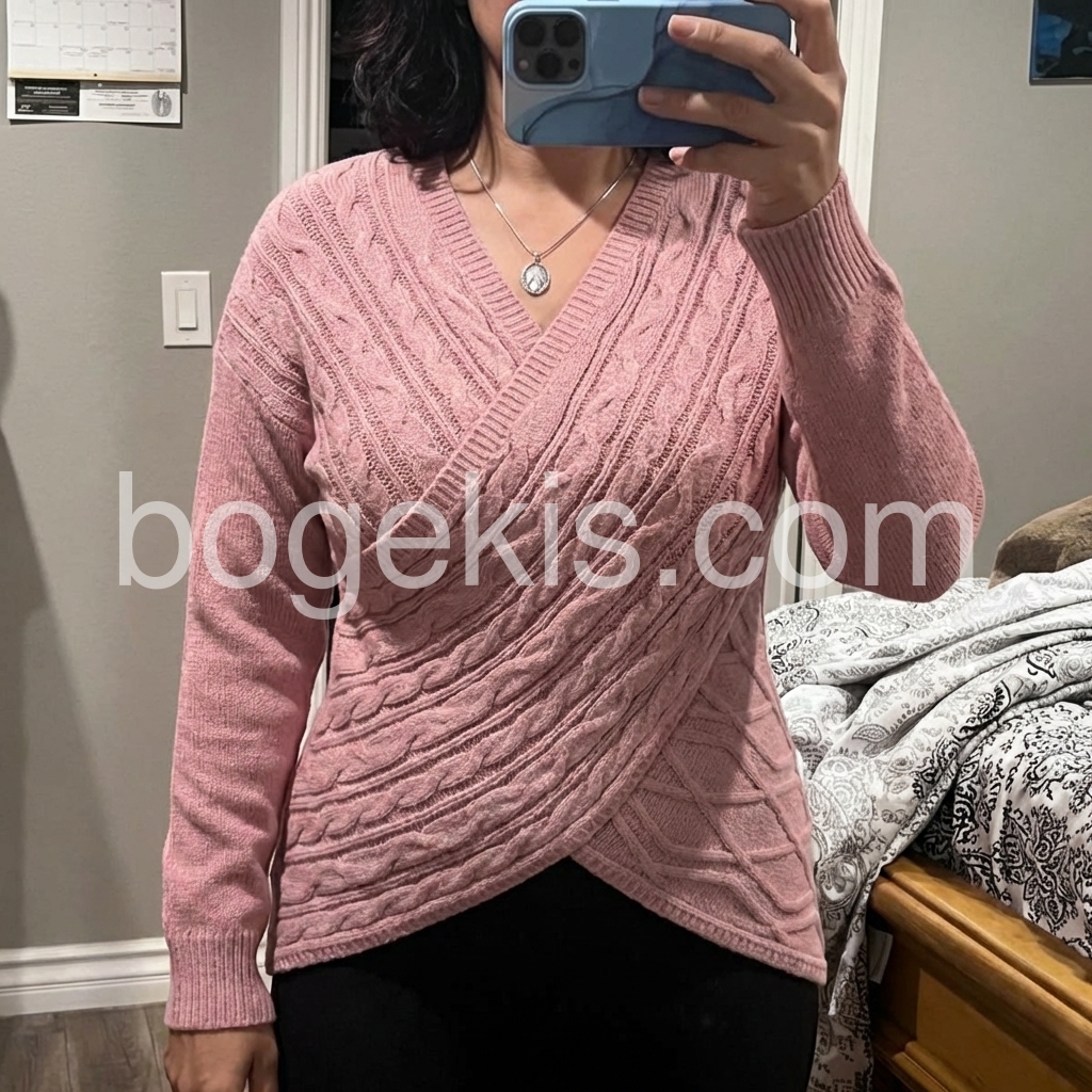 As soon as I saw this sweater, I knew I had to have it. The cross-over front design is unique, and the knit pattern is super charming. It feels comfortable, looks elegant, and works perfectly for everyday wear when I want something warmer and more stylish.