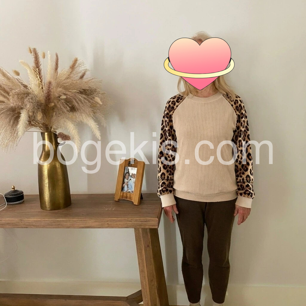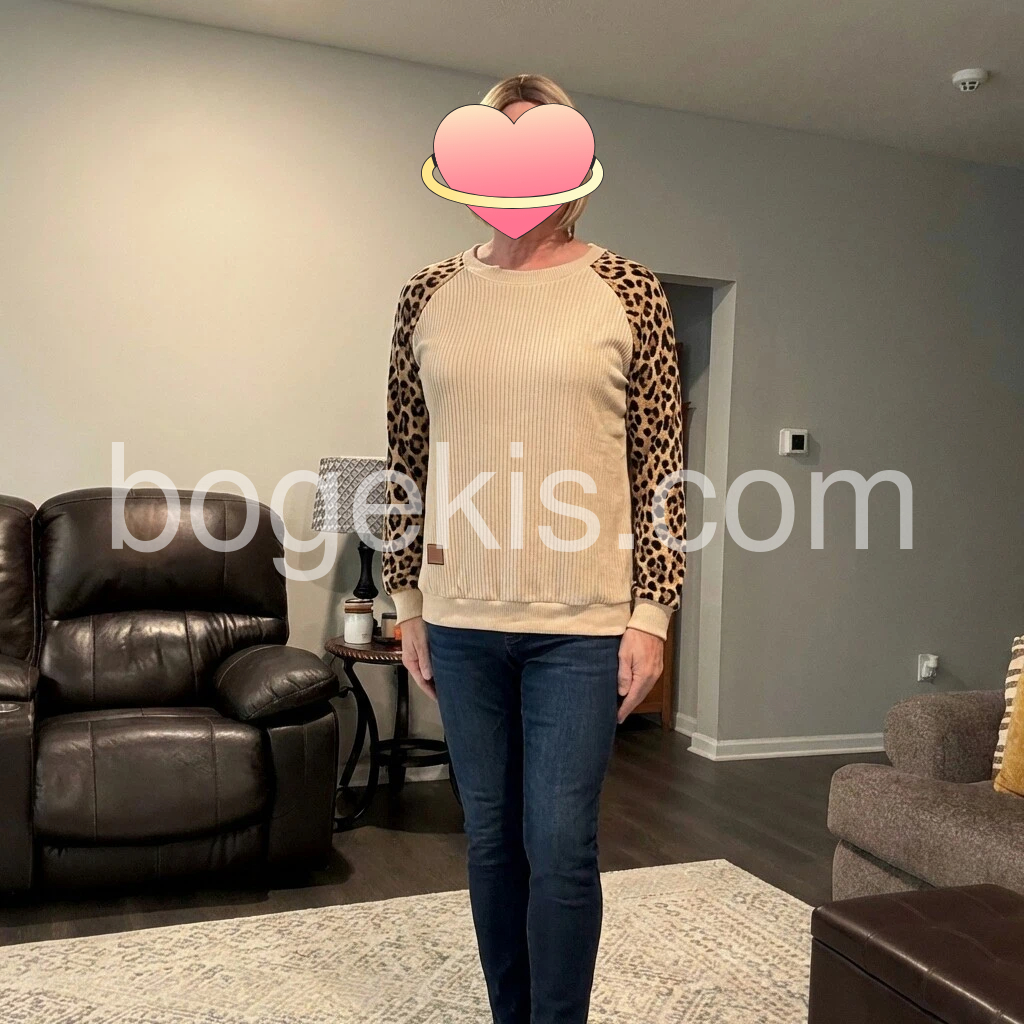 I really love this top! The beige knit is soft and comfortable, and the leopard print sleeves add a fun, stylish touch. The fit is flattering and the fabric feels well made. It’s great for fall layering and looks just like the photos.