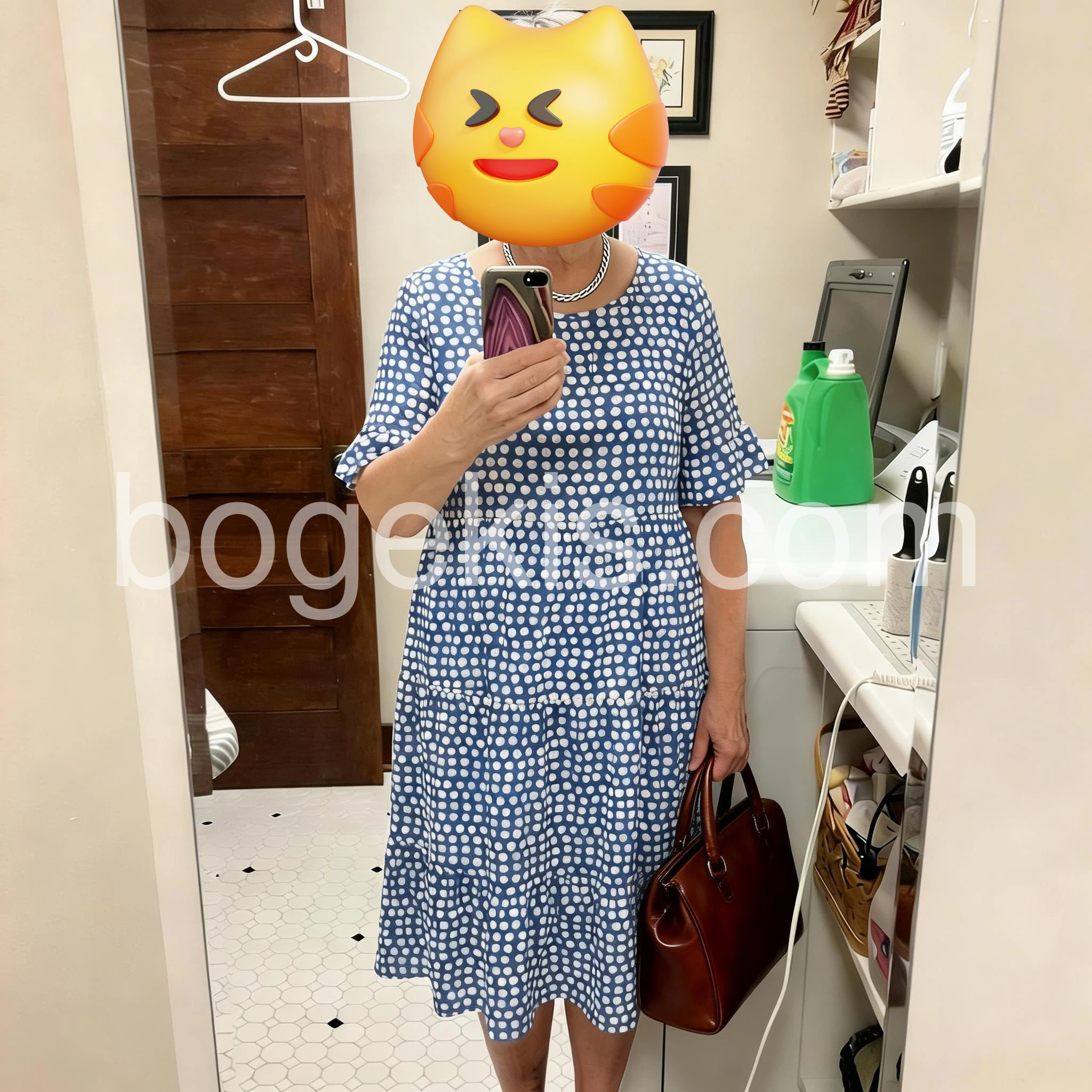 I love how effortless this dress looks while still feeling stylish. The fabric is light and breathable, and the relaxed cut is flattering in all the right ways—it skims my body instead of clinging. The blue-and-white dotted print is so classic. With a straw bag and simple sandals, it’s the perfect outfit for a getaway or a sunny day out.