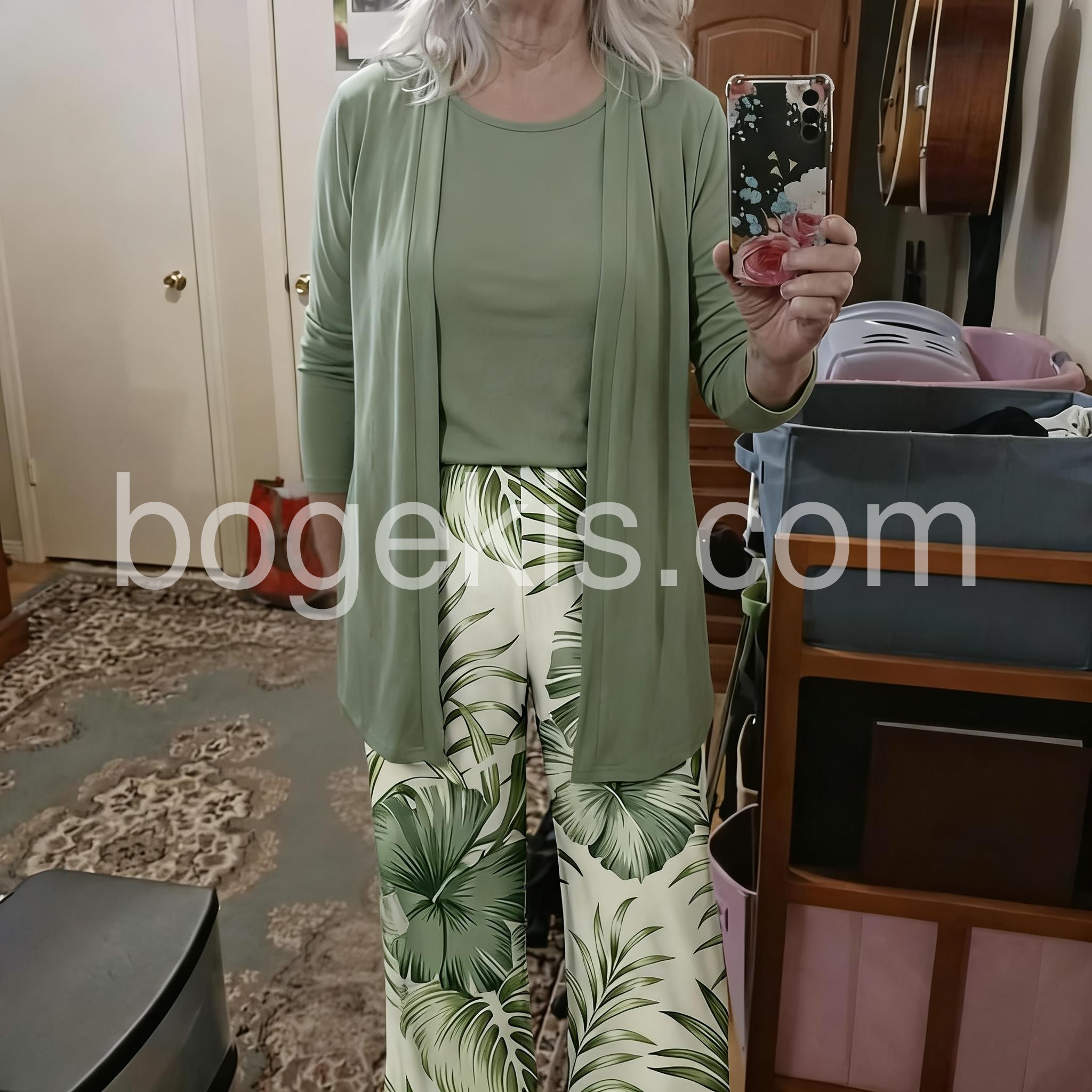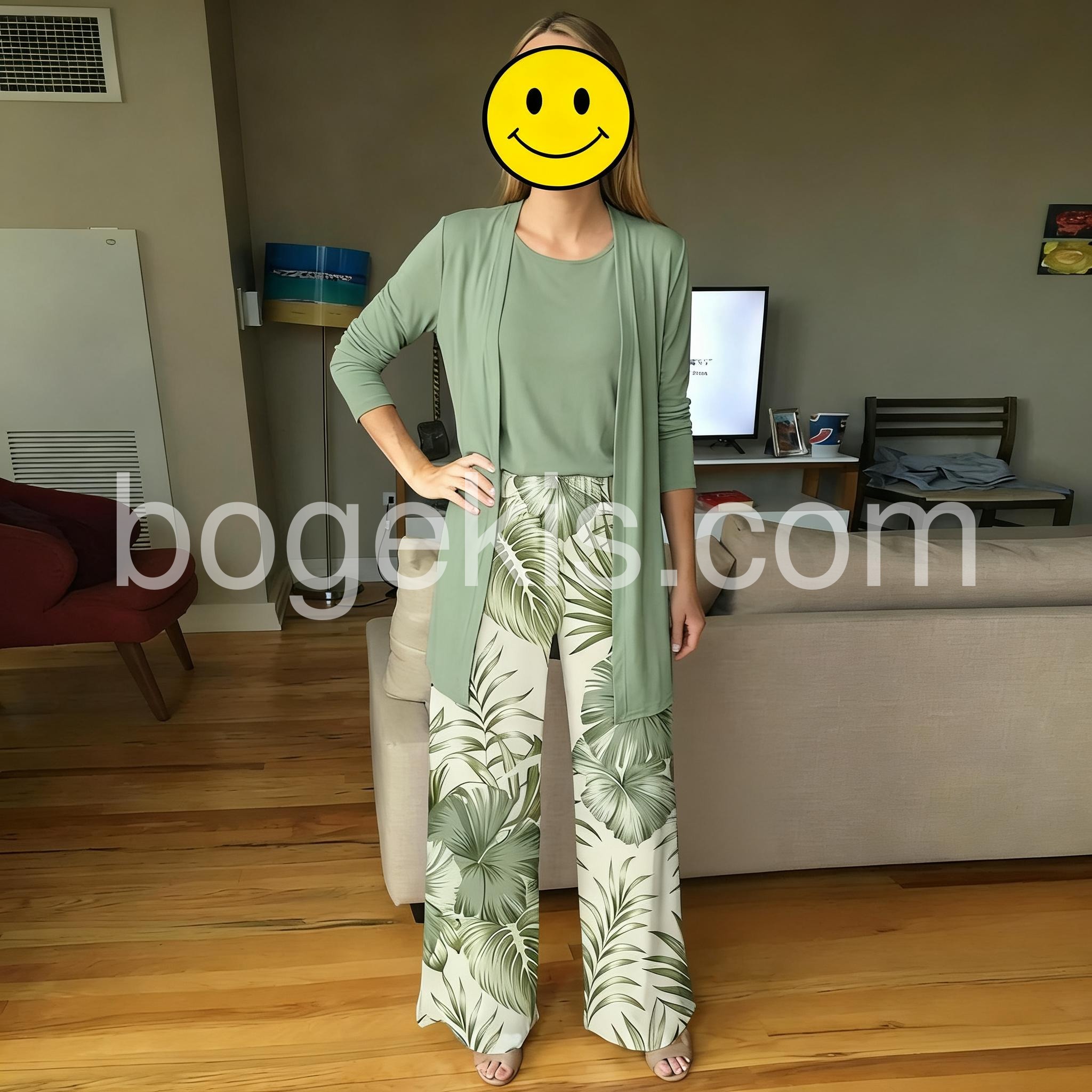 Beautiful outfit! The tropical leaf print on the pants is so vibrant and matches the solid sage green top exactly. It feels like wearing pajamas but looks chic and put together. Washing it was a breeze, no shrinking.