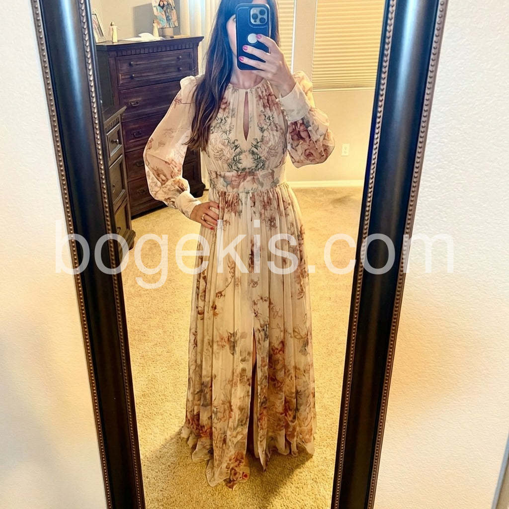 This dress is absolutely stunning! The fabric is so light and flowy, making it perfect for a fall wedding. The floral pattern is delicate and vintage-looking. I received so many compliments.
