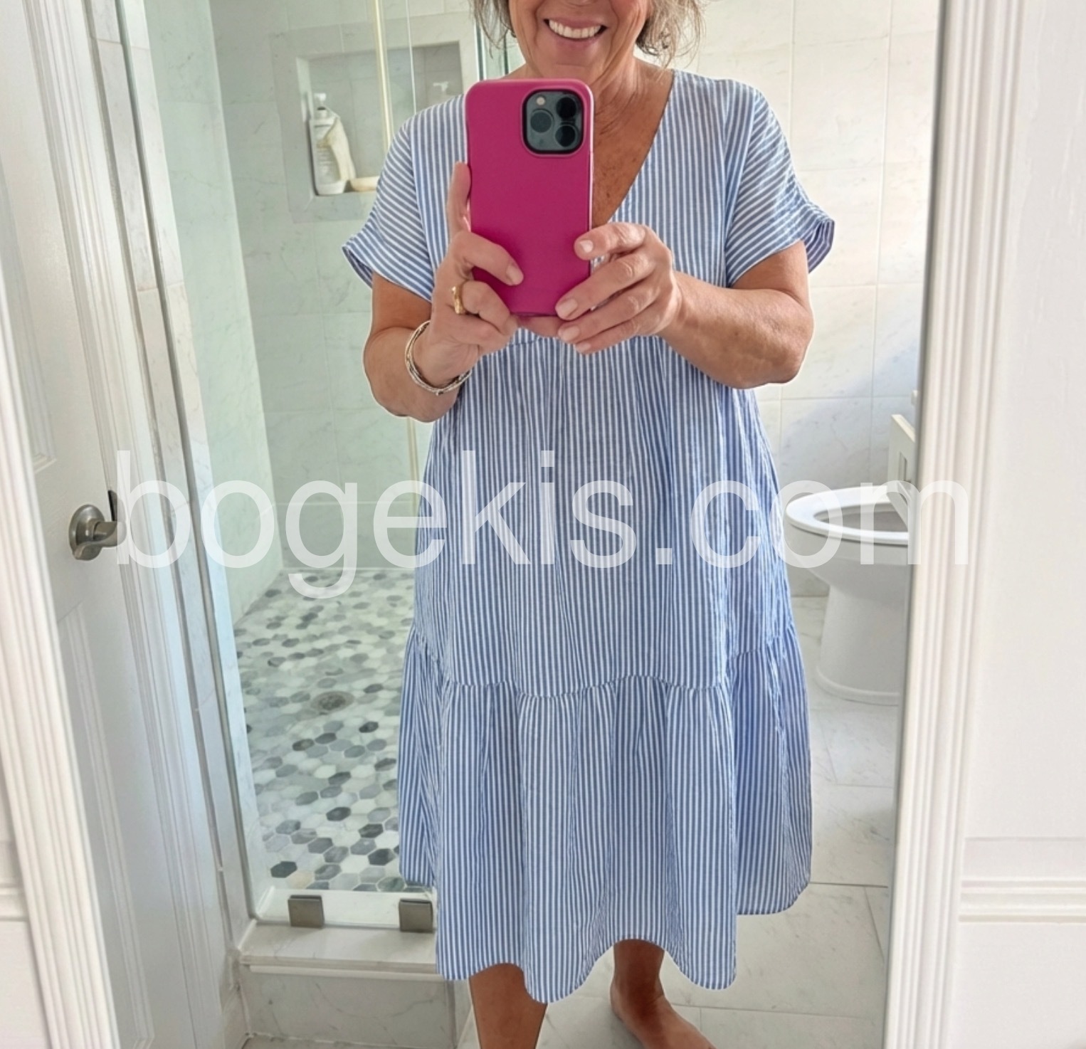 I bought this dress last week and I'm absolutely in love with how airy it feels. The light blue and white stripes look even better in person, and the V-neck is flattering without being too deep. It is the perfect summer casual dress.