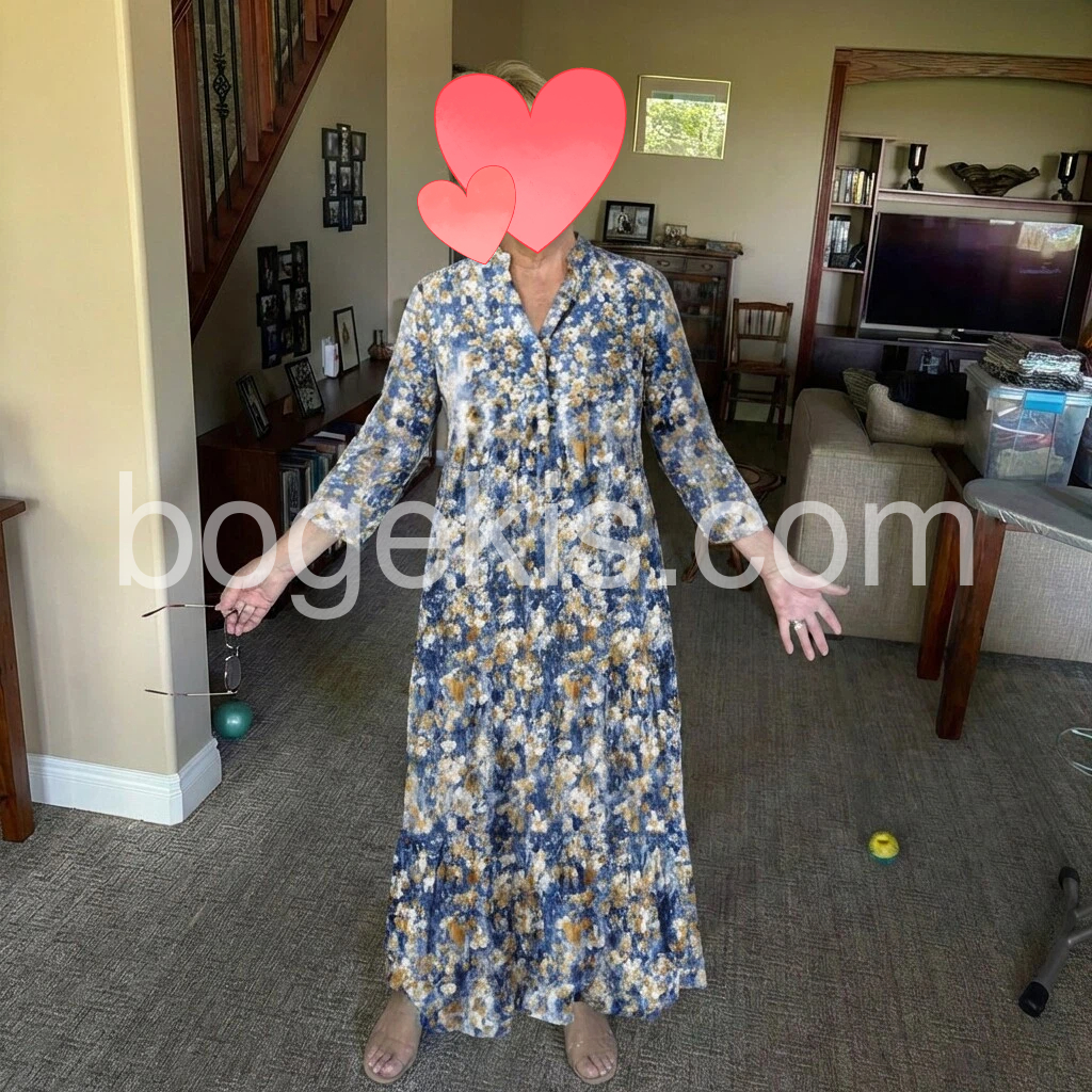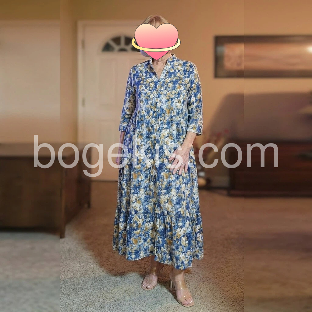 I’m really pleased with this dress! The blue and yellow floral pattern is beautiful and looks exactly like the photos. I love the V-neck and the three-quarter sleeves, and the dress has a flattering, flowy fit that feels comfortable to wear. The fabric hangs nicely and doesn’t feel stiff. Overall, it’s a lovely, effortless maxi dress that’s perfect for daytime outings, and it matches the listing well.