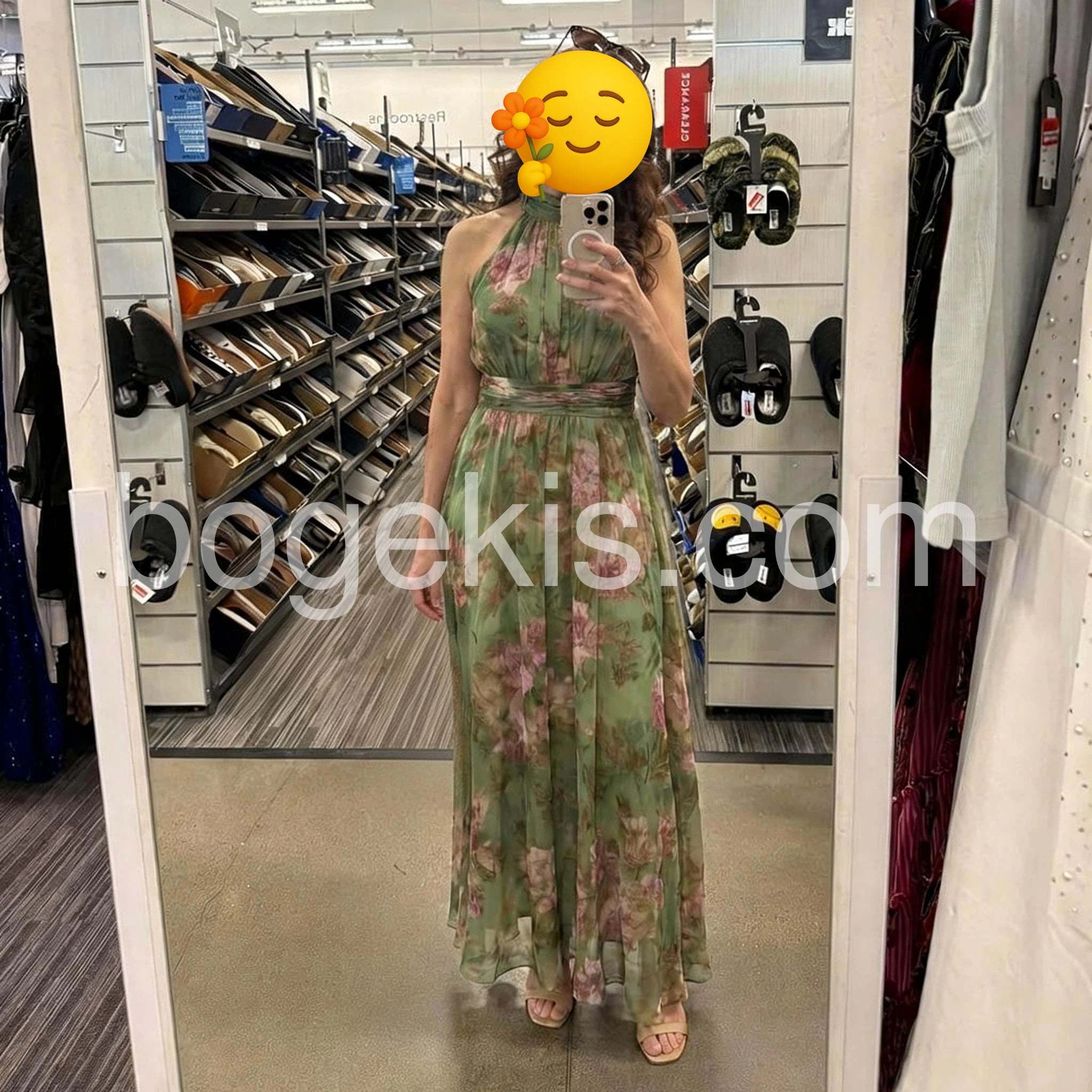 I usually avoid halter dresses but this one is incredibly comfortable and does not pull on my neck. The soft floral print on the green background is so feminine. Love it!