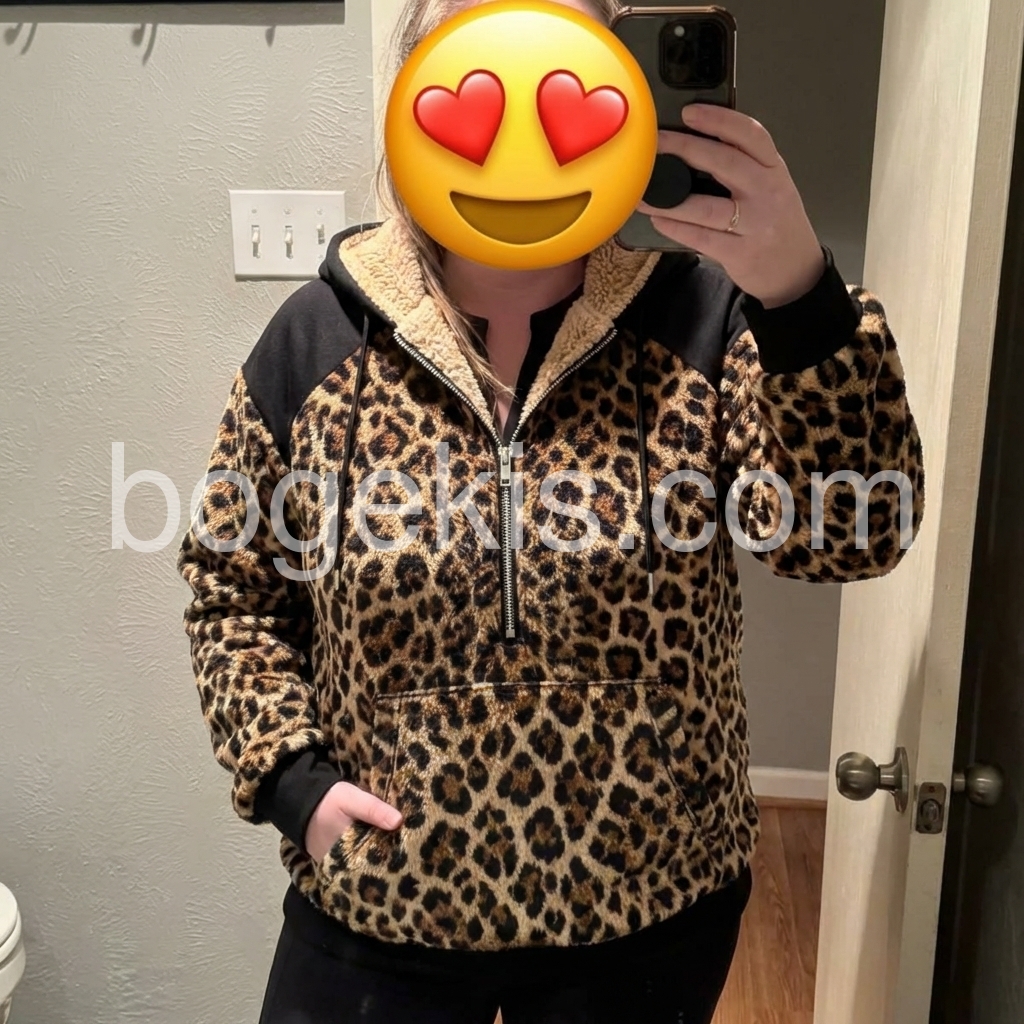 I absolutely love this hoodie! The leopard print is bold but still stylish, and the black base makes it feel super wearable. The zip-up design with the cozy sherpa lining around the hood and front is such a nice touch warm and flattering. I’ve worn it a few times already and it still looks fresh and high-quality.