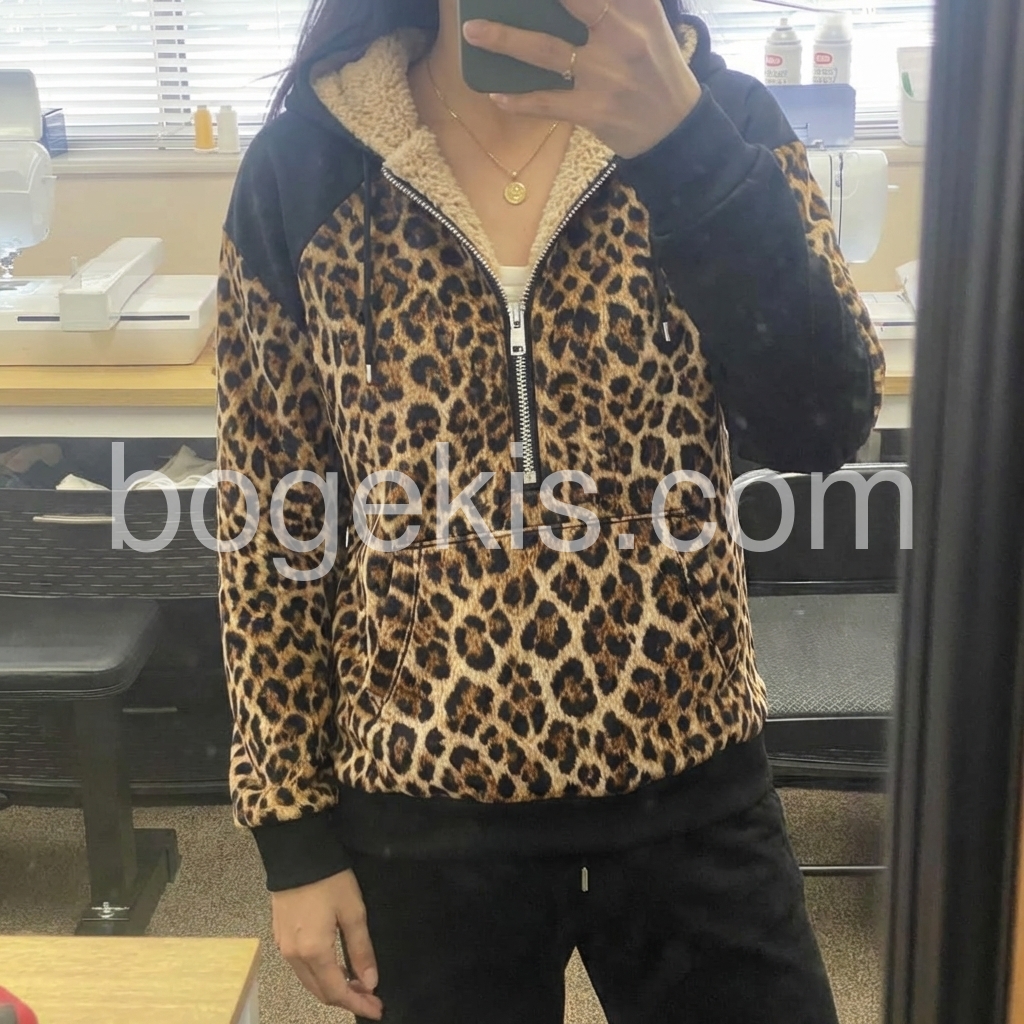 I bought this for Jessica, and she loves it! The hoodie looks super trendy with the full leopard pattern, but the black details balance it out nicely. The fabric feels soft, and the lining helps keep you warm without being too heavy. It’s become her go-to casual outfit for weekends, and she says it’s comfortable all day.