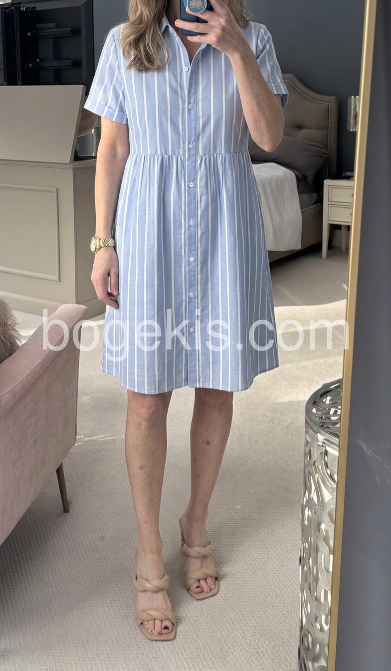 This shirt dress is so flattering! The vertical stripes really elongate the figure, and the gathered waist hits at just the right spot to hide any tummy insecurities. It is surprisingly versatile too; I can wear it with sandals for a casual day out or dress it up with wedges.