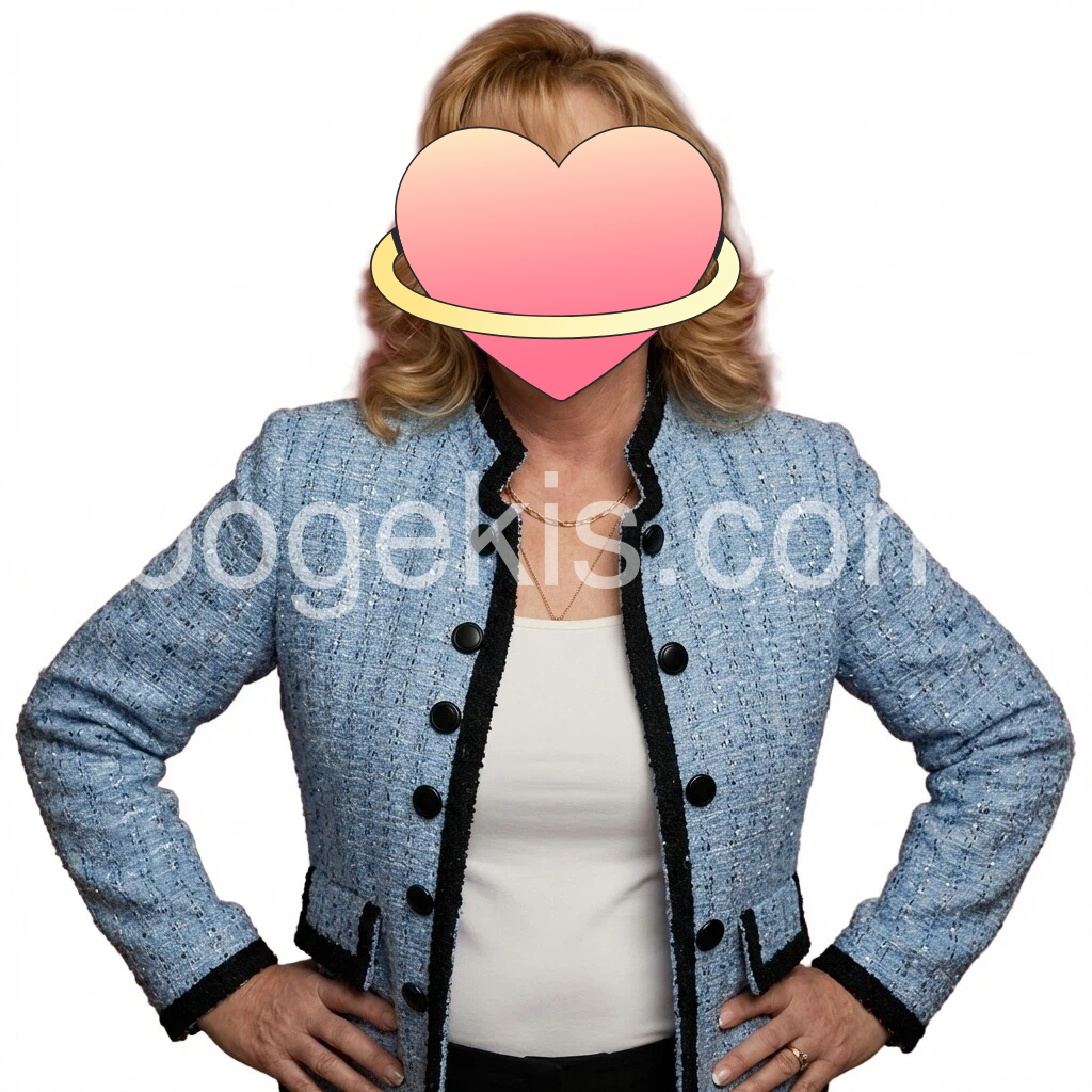Blue Tweed Blazer With Black Trim And Double Button Design