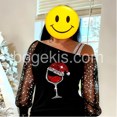 This elegant long-sleeved holiday Christmas shirt features a glittering print of a tipsy red wine glass with a Santa Claus hat, spreading the holiday cheer with a super-fun vibe, ready for par-tay good times! This black off-shoulder asymmetrical shirt features sheer long sleeves elevating this top to a luxe look for any date night. Machine wash cold tumble dry low to medium heat. Iron if needed or lay flat to dry.