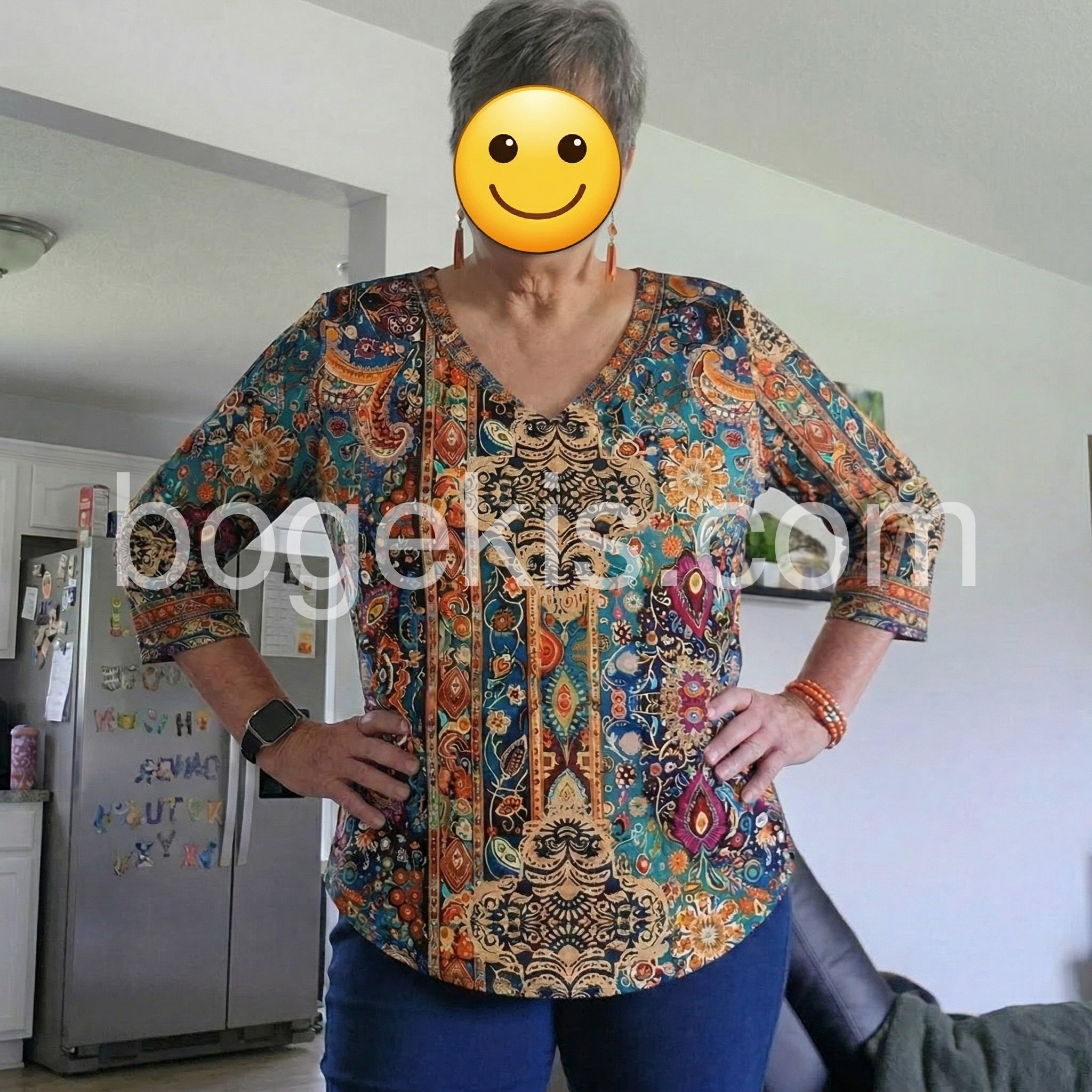 I love everything about this blouse. The colors are lovely, the material is quality and above all the 3/4 sleeves comfortable. I highly recommend this beautiful blouse.