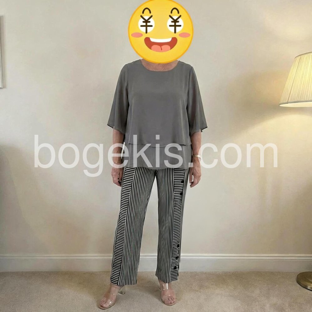 I absolutely love this two-piece set! The grey top is incredibly flattering and hides any tummy imperfections with its layered design. The striped pants are so stylish with the side buttons. Highly recommend for a comfortable yet chic look.