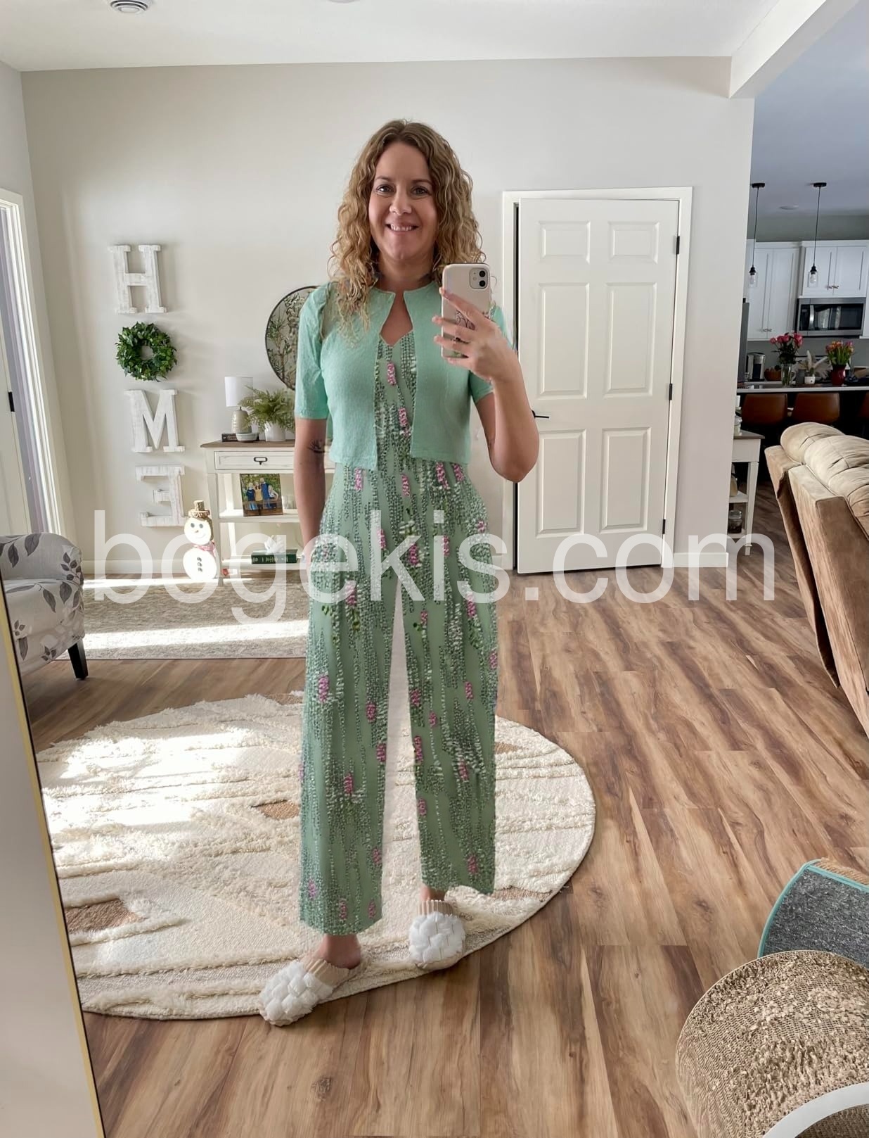 I wore this mint green jumpsuit to my nieces spring wedding and received so many compliments! The fit is incredibly flattering, especially around the midsection. The matching jacket is a lovely touch for when the evening gets a bit chilly. Highly recommend!