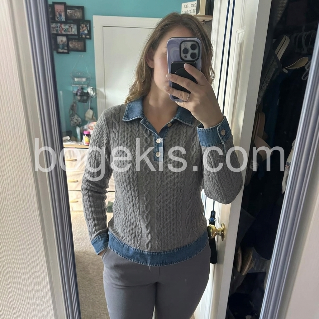 I’m really impressed by the design of this knit sweater. The gray cable pattern looks rich and detailed, and the denim accents make it feel more elevated than typical sweaters. The fit is comfortable and easy to style, and it holds up well when worn for a full day. I’ve already recommended it to friends!