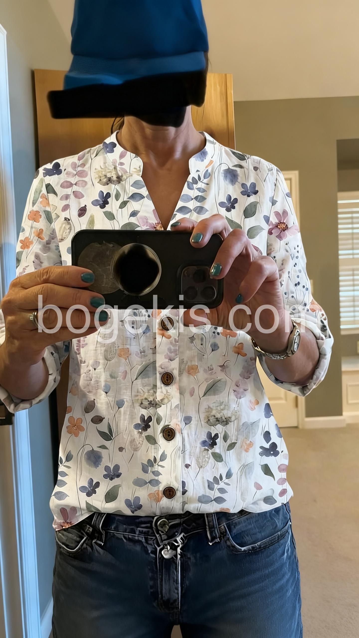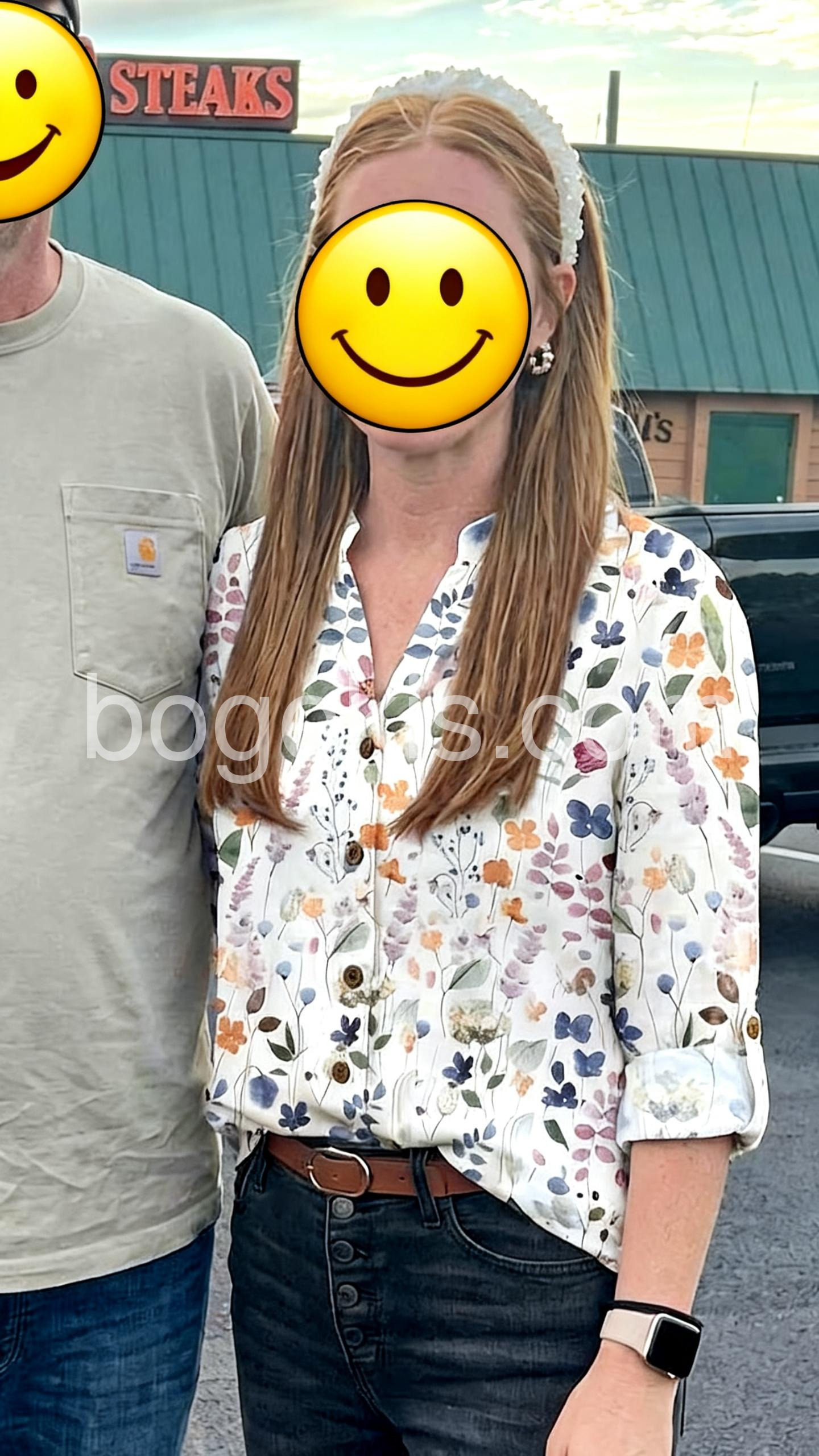 This long-sleeve blouse features a delicate watercolor floral print in soft pastel tones. The V-neck and button-down front add a classic touch. Lightweight fabric perfect for spring and summer. Pair with jeans or skirts for effortless style. Ideal for casual outings or relaxed days.