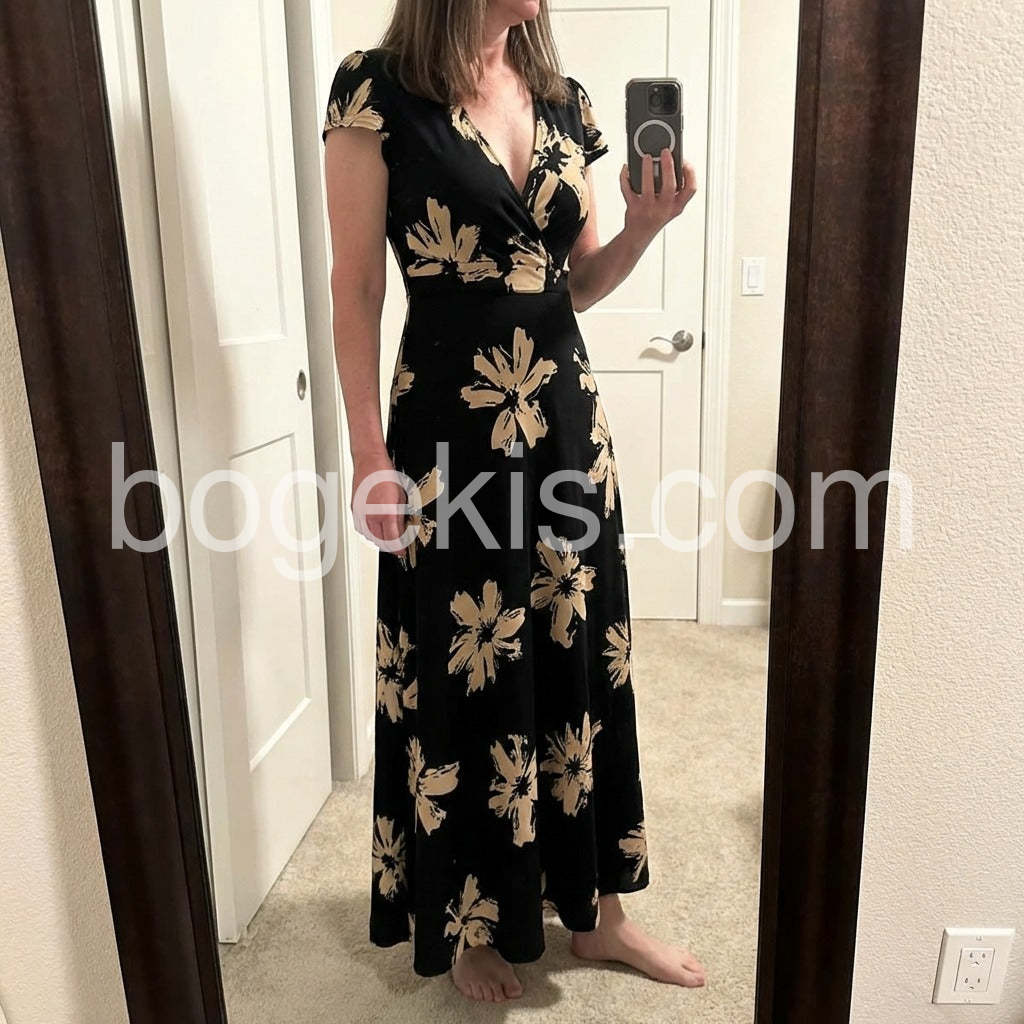 I absolutely love this dress! The black and beige floral pattern is incredibly striking and elegant. I wore it to a beach wedding and received so many compliments. The v-neck is flattering without being too revealing, and the material is soft and flowing. Highly recommend!