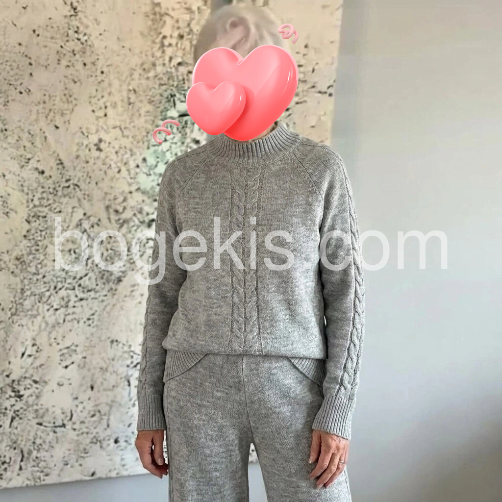 I love this set! The gray knit is soft and warm, and the cable detail on the sweater looks really nice. The pants fit comfortably and the whole outfit has a flattering, relaxed look. It’s perfect for staying in but still looks put together. Looks exactly like the photos and feels well made.