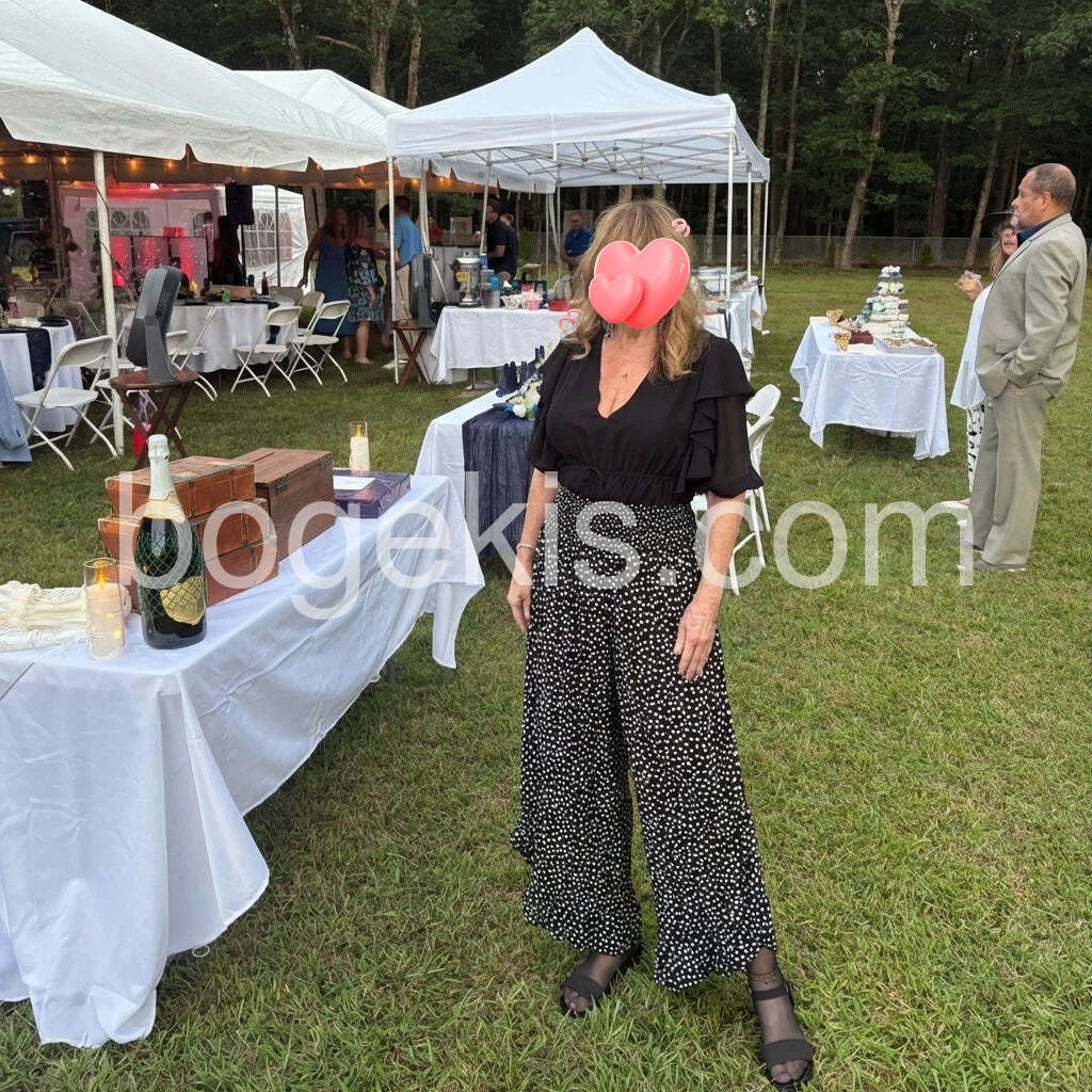 This outfit is absolutely chic for an outdoor event. The black v-neck blouse with ruffled sleeves pairs perfectly with the polka-dot wide-leg pants--stylish, comfortable, and flattering. Great for garden parties, brunches, or tented receptions. Fit runs true to size; durable fabric that drapes nicely.