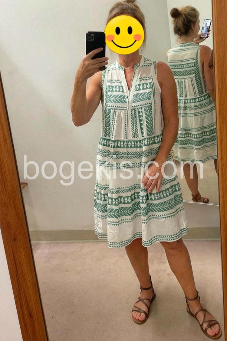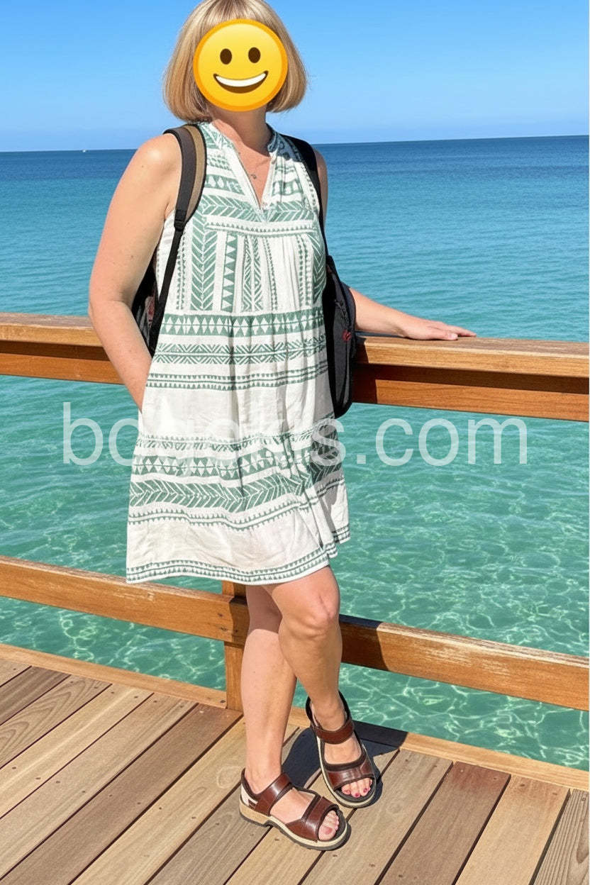 Absolutely love this dress! The green geometric pattern is so cute and perfect for summer. It is incredibly lightweight and airy making it my go-to for hot days.