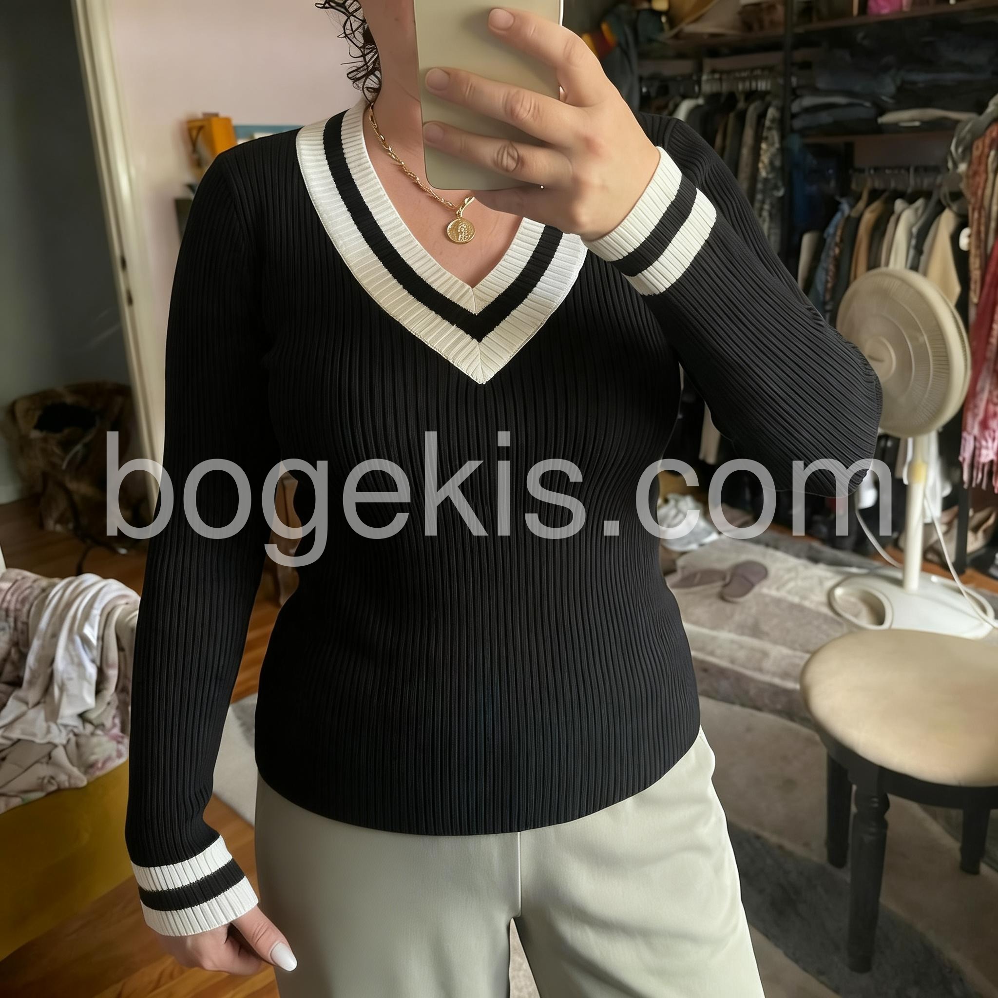 This is exactly the kind of sweater I’ve been looking for. I love that it looks polished even with minimal effort. The black knit looks sleek, while the white striped detailing adds a stylish contrast that frames the neckline beautifully. The fabric feels soft and comfortable against the skin, and the overall construction looks neat and durable. Definitely a wardrobe staple I’ll keep reaching for.