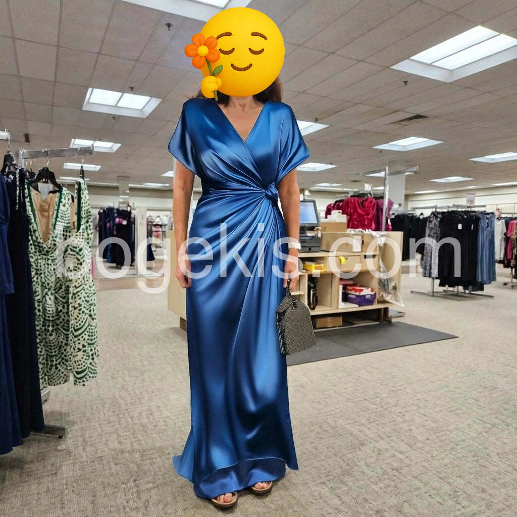 This blue satin maxi is stunning and perfect for online once you try it on at home. The wrap design with a waist knot creates a flattering silhouette, and the satin drapes beautifully. The color is rich and elegant, ideal for formal events or a classy evening out. Pairing with a small purse and simple sandals gives a polished, effortless vibe. True to size with good movement in the fabric. Smooth checkout and responsive customer support--highly recommended for a glam look you can wear online shopping with confidence.