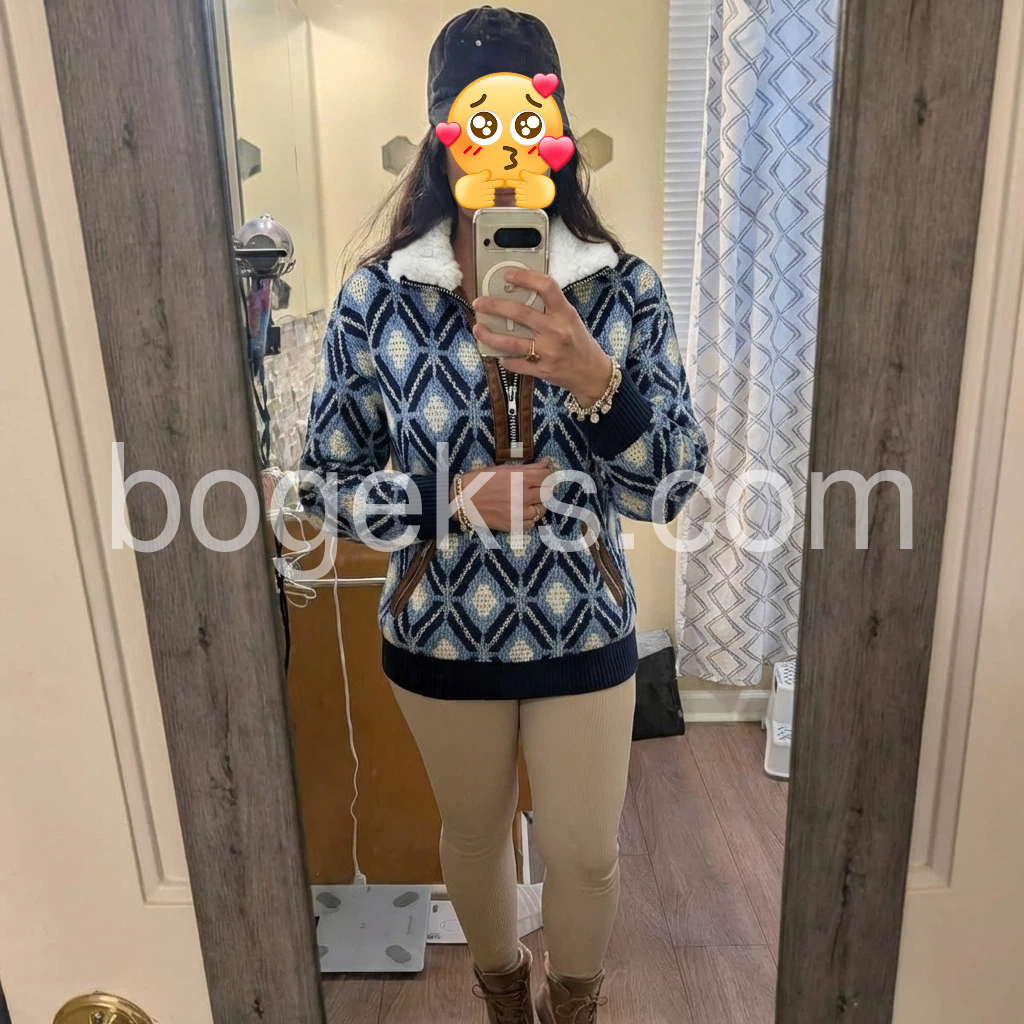 This sweater is the perfect blend of cozy and chic! The geometric pattern in shades of blue and white is so classic and timeless, and the fur collar makes it feel extra special. The leather trim on the zipper and pockets adds a nice detail that elevates the whole look. The fabric is soft and stretchy, so it’s comfortable to wear all day. I love pairing it with jeans and boots for a casual, outdoorsy look. It’s quickly become my go-to for cool weekends!