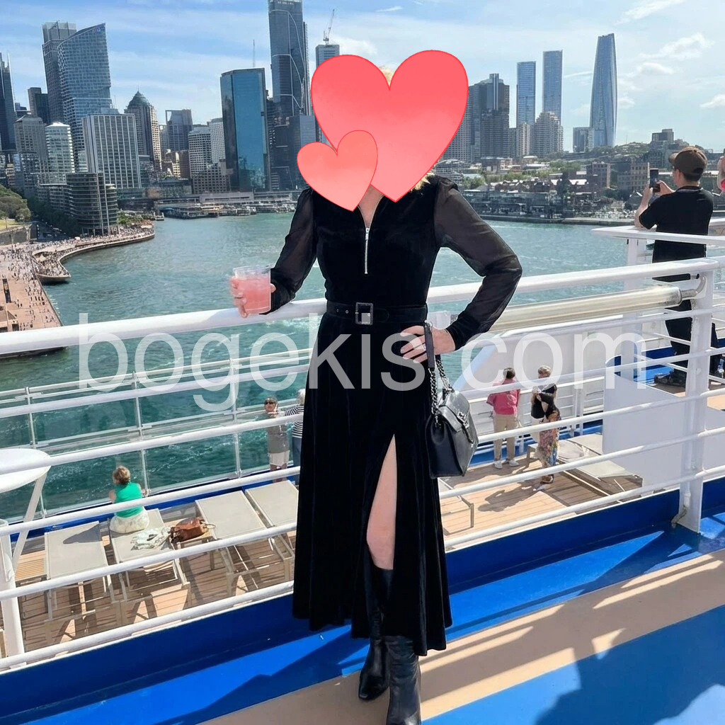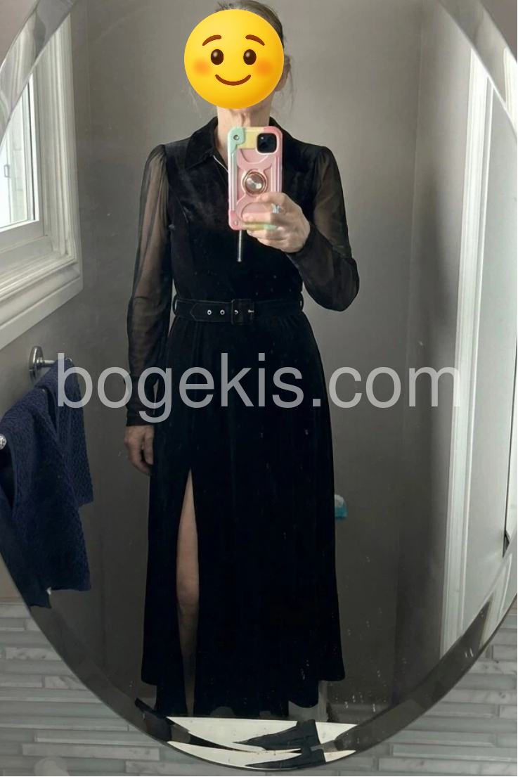 This is a beautiful black maxi dress. The zip neckline and the waist belt create such a flattering shape, and the length is perfect with boots. It feels comfortable while still looking very polished and elegant. I wore it on a cruise and got compliments right away.
