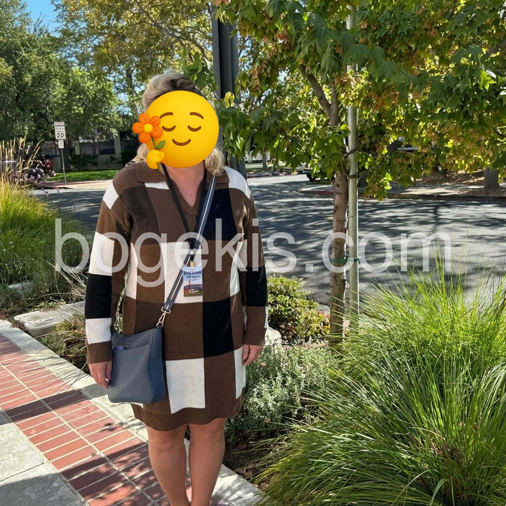 Chic checkered knit dress -- cozy yet polished. The color block pattern is stylish and versatile for everyday wear. Paired with pearl necklace and gold sandals, it looks effortlessly elegant. Comfortable fit and great quality for the price. Smooth online order, fast shipping, and responsive customer support. Highly recommended.