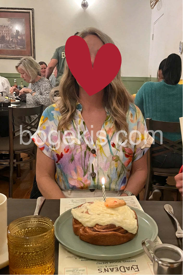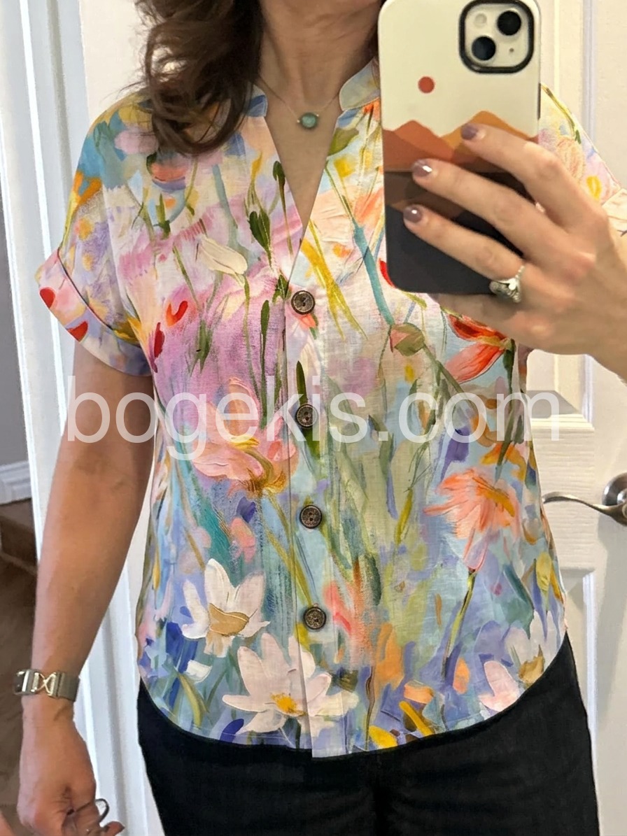 Elevate your seasonal wardrobe with this Chic Watercolor Floral Print Short Sleeve Top, a dreamy and artistic top that captures the essence of blooming spring. Crafted from lightweight, breathable fabric—likely cotton or rayon blend—this short-sleeve blouse features a delicate watercolor-inspired print in soft pastel hues of blush pink, lavender, peach, and sky blue, accented with hints of green and gold. The floral design flows across the fabric like a painted garden, creating a romantic and effortless look. A classic V-neckline and front button closure add structure and versatility, while the relaxed fit ensures comfort and ease. Perfectly paired with jeans, high-waisted shorts, or flowy pants, it’s ideal for casual outings, weekend brunches, or warm-weather strolls. Styled here with layered necklaces and a sleek watch, it blends boho charm with modern simplicity. Let this floral blouse bring a touch of gentle elegance and vibrant color to your everyday style.