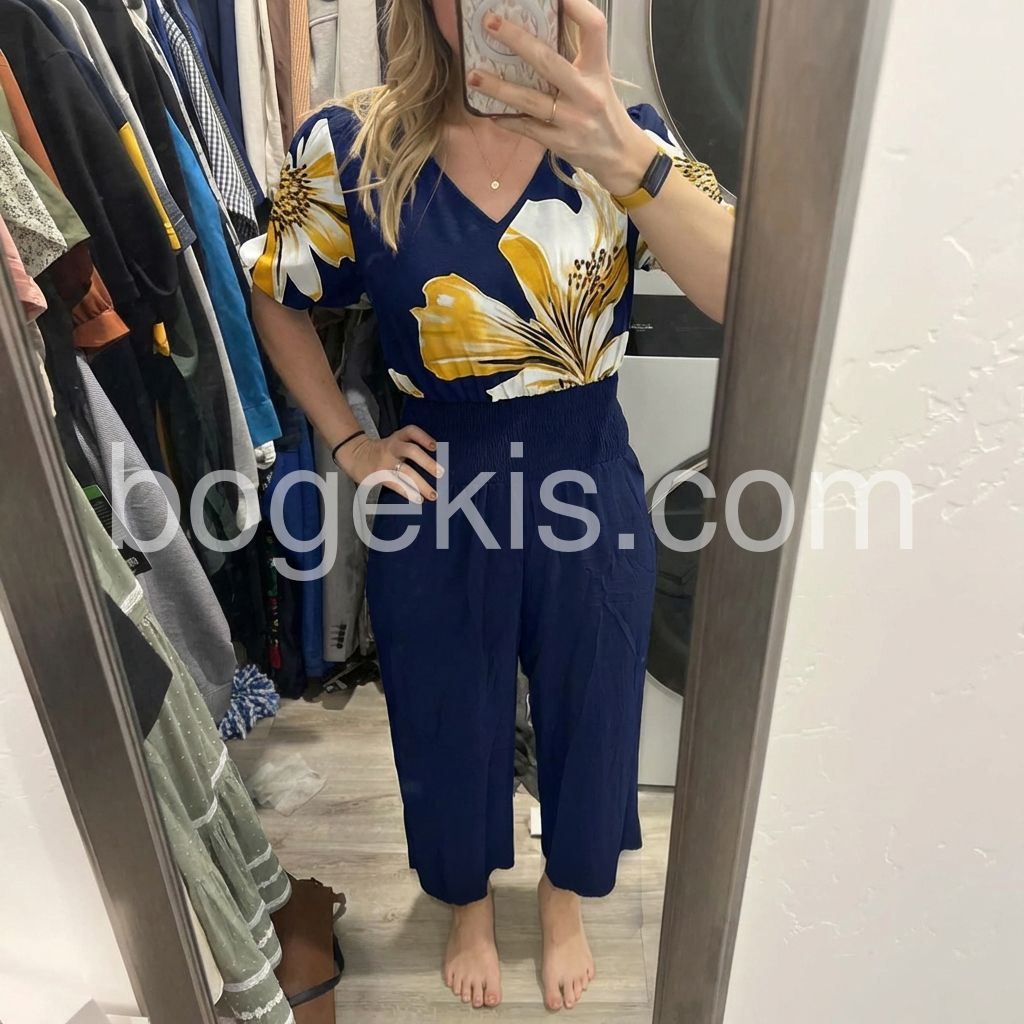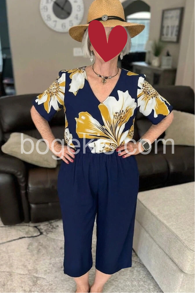 This floral jumpsuit features a bold white and gold flower print on a navy blue background. The V-neckline and three-quarter sleeves add a feminine touch. High-waisted design with wide-leg pants for comfort and style. Perfect for summer days or casual outings. Lightweight fabric ensures breathability and ease of movement.