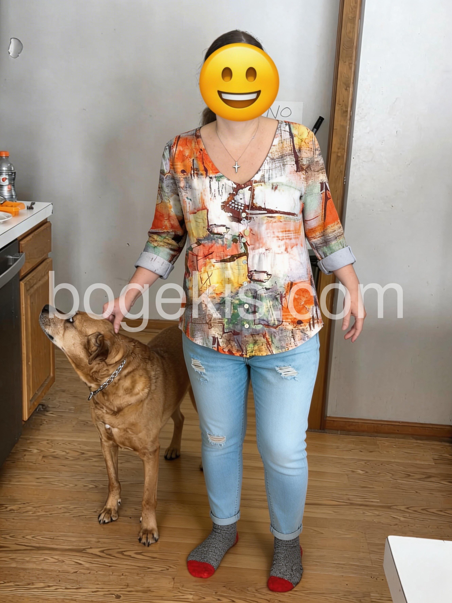 am obsessed with this watercolor print blouse! The blend of warm oranges, soft yellows, and subtle greens creates a stunning, artistic look that stands out without being overwhelming. The V-neck design is incredibly flattering. The fabric is lightweight, breathable, and has a lovely drape—no stiffness at all! It pairs seamlessly with jeans for a casual day out or dress pants for the office. The fit is true to size, and the small button detail adds a charming touch. I’ve already gotten multiple compliments and will definitely be buying more colors!
