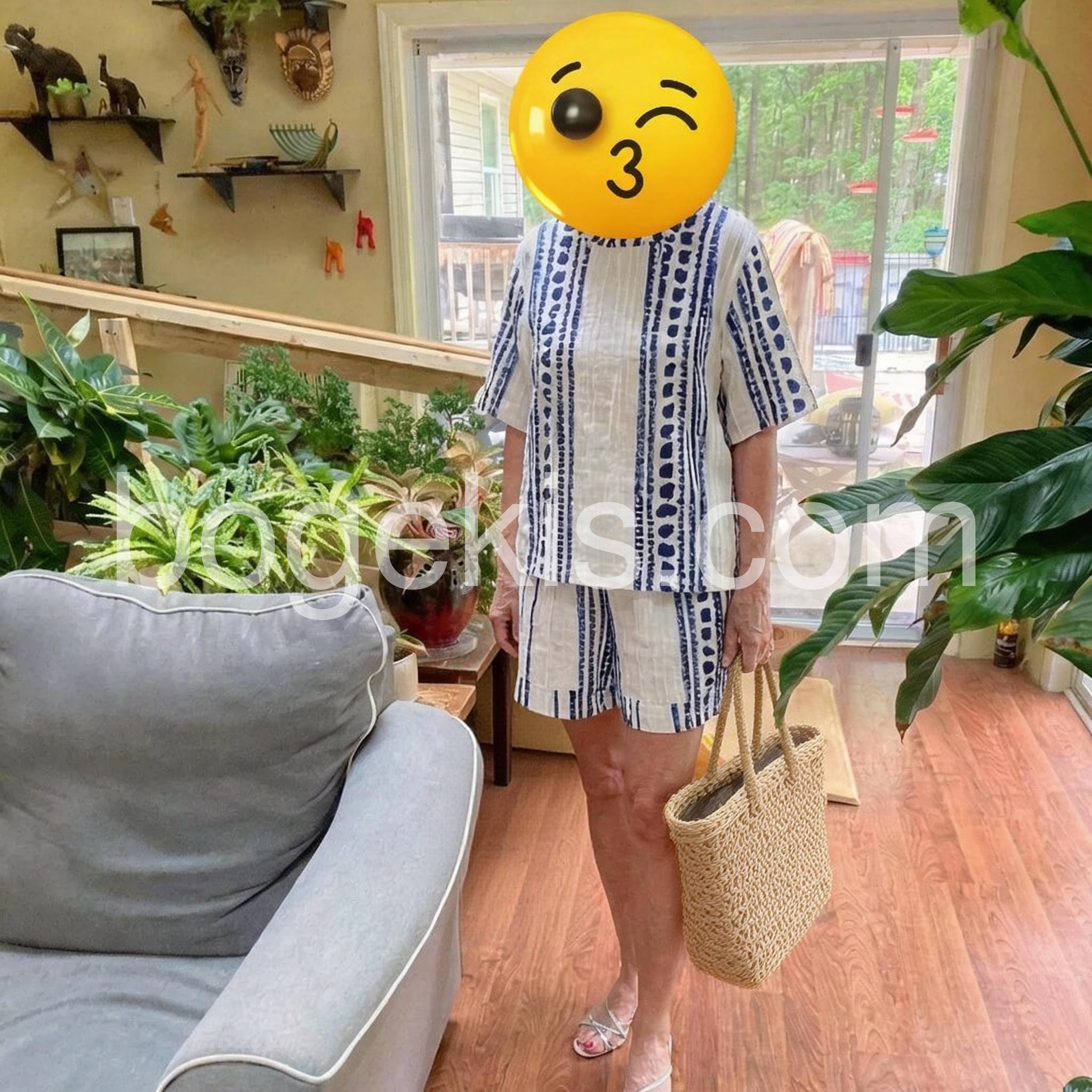 This matching set is absolutely delightful. The white and blue stripes look fresh and crisp, and the fabric feels light and breathableerfect for warm days. The fit is true to size, and the relaxed short silhouette is flattering and comfortable. The straw bag adds a perfect, tropical touch that ties the whole look together. Customer service was responsive, and delivery was quick, making the shopping experience smooth from start to finish. Highly recommend for a chic, effortless summer outfit.