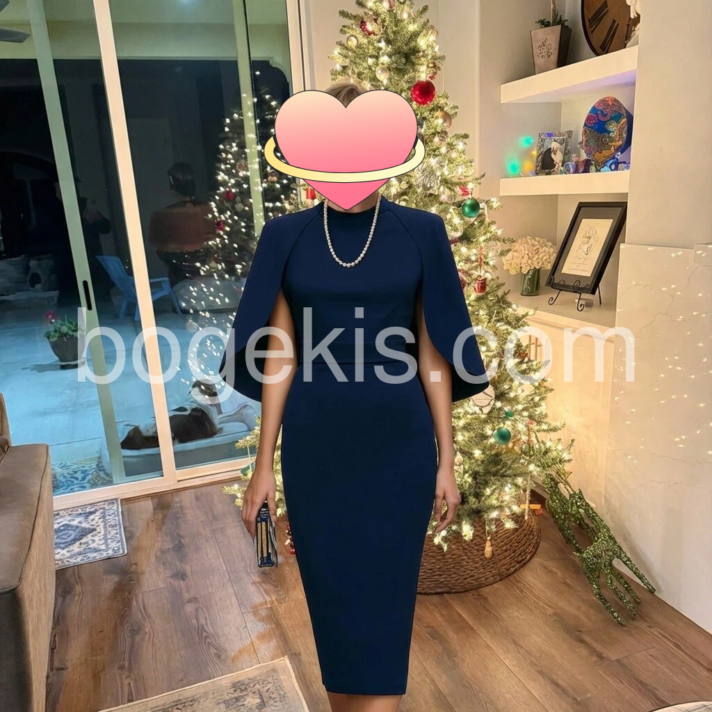 I absolutely love this dress! The navy color is elegant and the fit is very flattering. The cape flared sleeve style adds a refined touch and makes it look dressy without being uncomfortable. I also like the clean neckline and the way the waist is shaped. It feels like good quality and looks exactly as pictured—perfect for holiday events and special occasions.