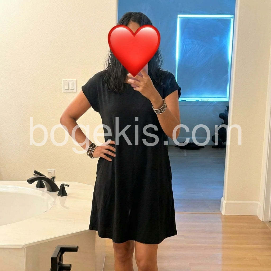 This chic and versatile black t-shirt dress offers the perfect blend of comfort and style for casual days. Featuring a relaxed, A-line silhouette with a round neckline and short cap sleeves, it provides a flattering and easy-to-wear look. The soft, lightweight fabric drapes beautifully, making it ideal for lounging at home, running errands, or casual outings. Two spacious side pockets add both functionality and a subtle detail to the minimalist design. The slightly asymmetrical hemline adds a modern touch, enhancing its effortless appeal. Pair it with sandals, sneakers, or boots depending on the occasion—this timeless piece is a wardrobe staple for anyone who values simplicity, comfort, and understated elegance. Perfect for summer days, travel, or cozy weekends.