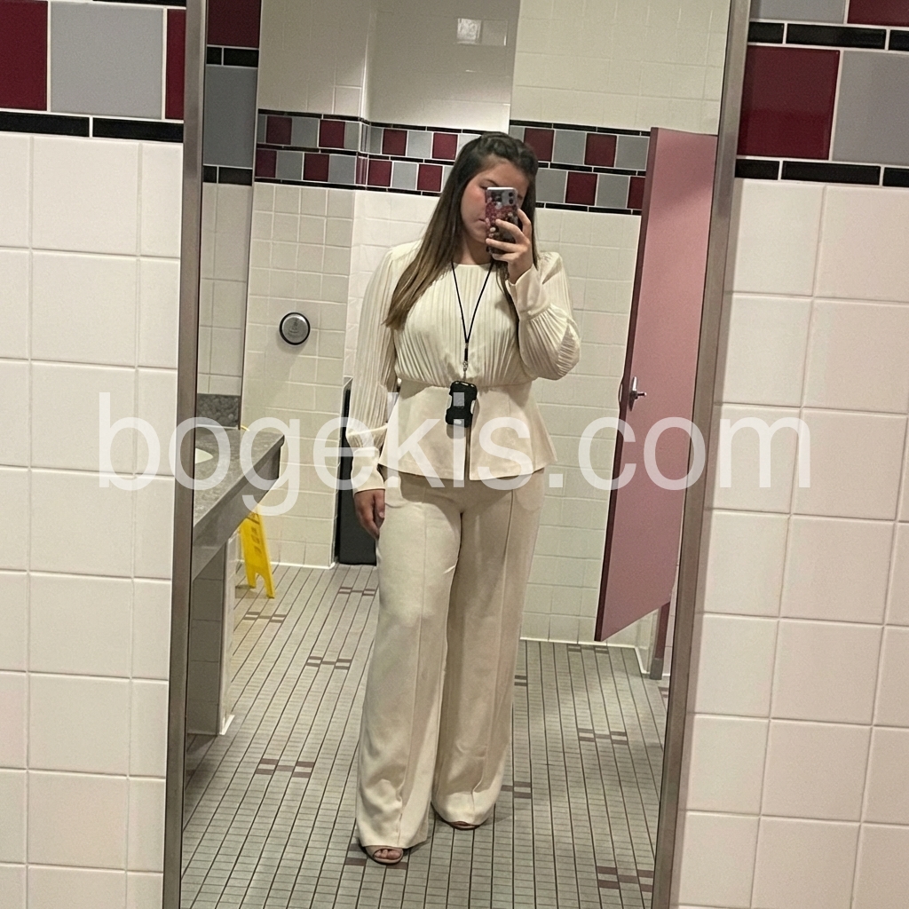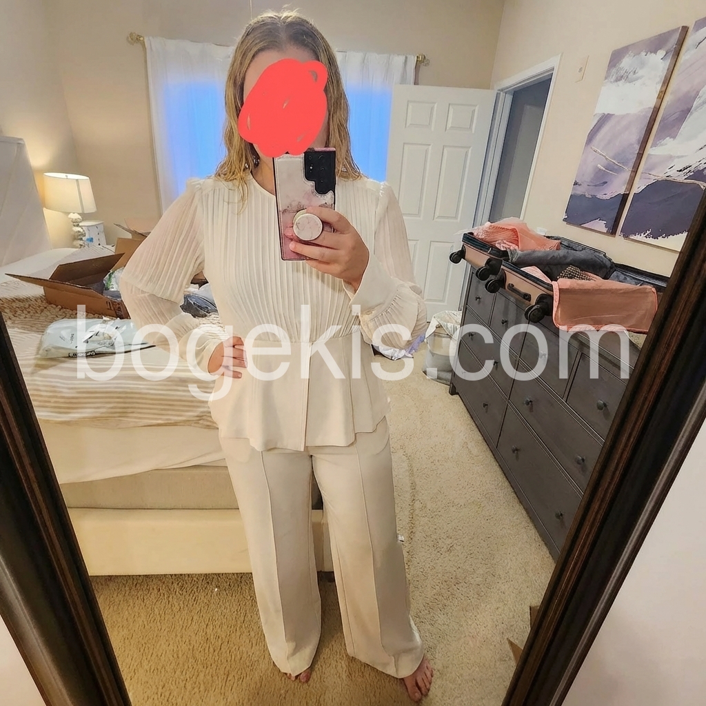 I’m obsessed with this elegant cream coord set! The gathered pleats on the blouse add such a sophisticated, feminine touch, and the flared peplum hides any midsection concerns beautifully. The wide-leg trousers are high-waisted and structured, giving a polished, tailored look without being stiff. The neutral cream color is so versatile, and the fabric is breathable enough for year-round wear. I’ve styled it with heels for formal events and flats for casual outings—it elevates every look effortlessly. My new favorite outfit!
