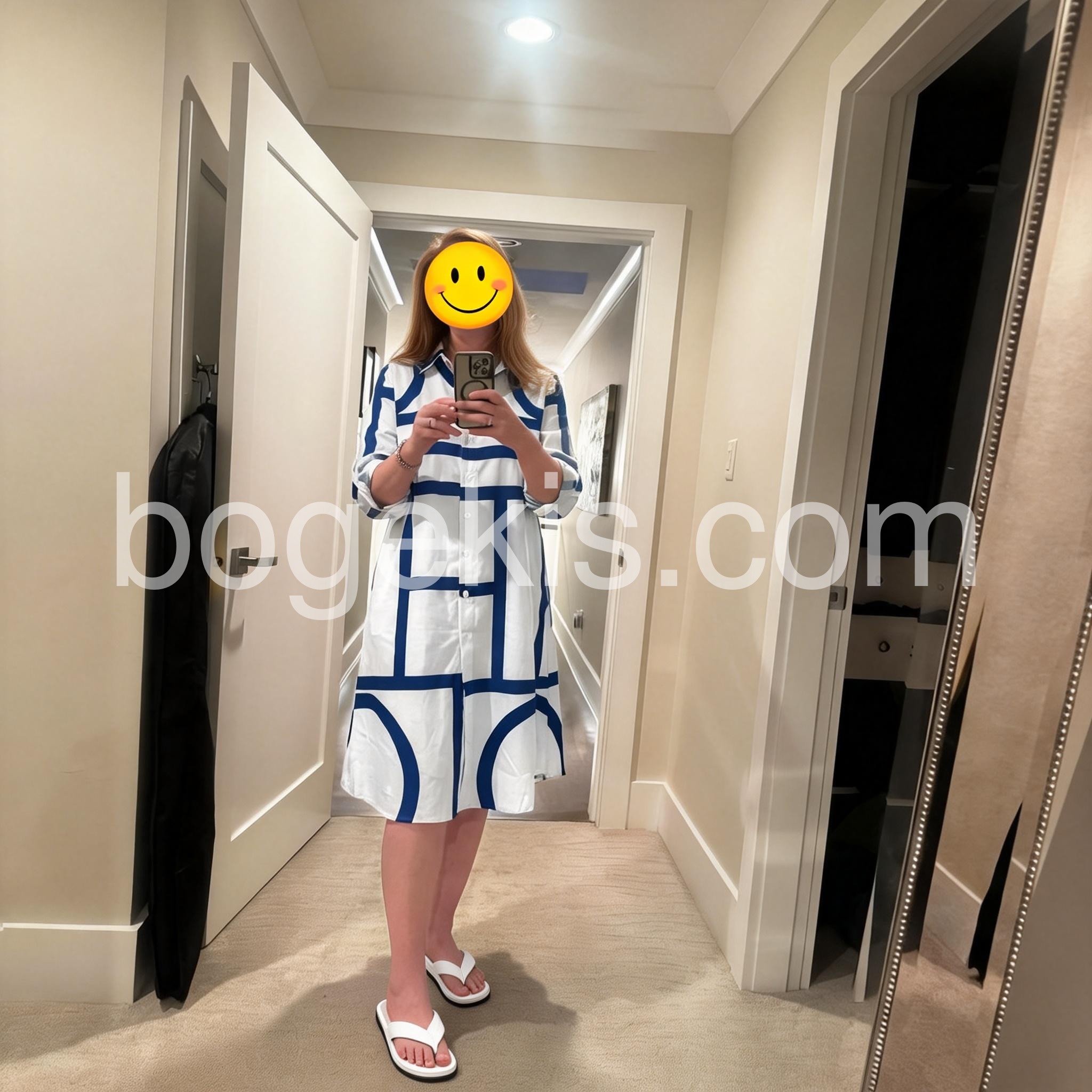 This dress is absolutely gorgeous! The navy blue lines really pop against the crisp white background. It has a very flattering, breezy fit that is perfect for hot weather. I highly recommend it to anyone looking for resort wear.