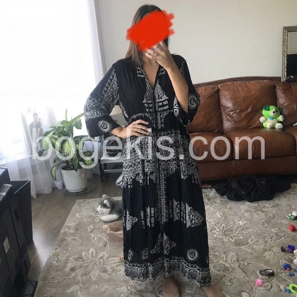 I’m obsessed with this black and white printed dress! The detailed ethnic patterns add so much character, and the oversized silhouette is both cozy and stylish. The fabric is soft and breathable, ideal for warm weather. I’ve worn it to brunch and a beach picnic, and it always gets compliments. It’s the ultimate piece for embracing a laid-back, boho vibe!